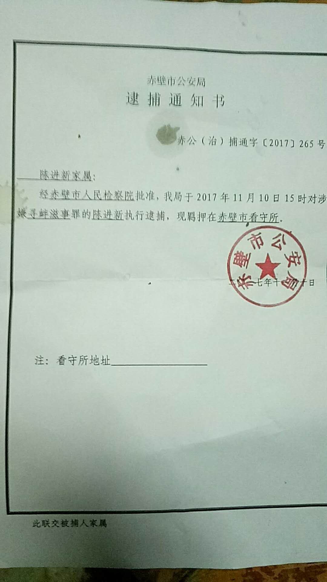 另外,赤壁陈剑雄的姐姐亦于日前收到赤壁市公安局发出的《逮捕通知书》,通知书显示赤壁市公安局是在11月10日经赤壁市检察院批准以“寻衅滋事罪”对陈剑雄进行逮捕的,羁押在赤壁市看守所。此事与陈剑雄女友梁一鸣(同案)取保后声称陈剑雄和袁兵已被逮捕的消息吻合,目前暂时未有袁兵家属收到《逮捕通知书》的消息,估计亦会在最近收到。由于陈剑雄身有旧患,梁一鸣取保后一度传出陈剑雄患病的消息。据梁一鸣猜测,陈剑雄在看守所患病可能与旧患有关。陈的旧患源于2014年3月围观黑龙江建三江事件,当时陈剑雄受到毒打后以致腰股位置受伤糜烂,可能由于当时该地环境恶劣导致细菌感染,致使伤口一直未能愈合,并经常复发炎症甚至流脓。由于目前陈剑雄案未有律师跟进,要等律师会见后才能确认详情。
