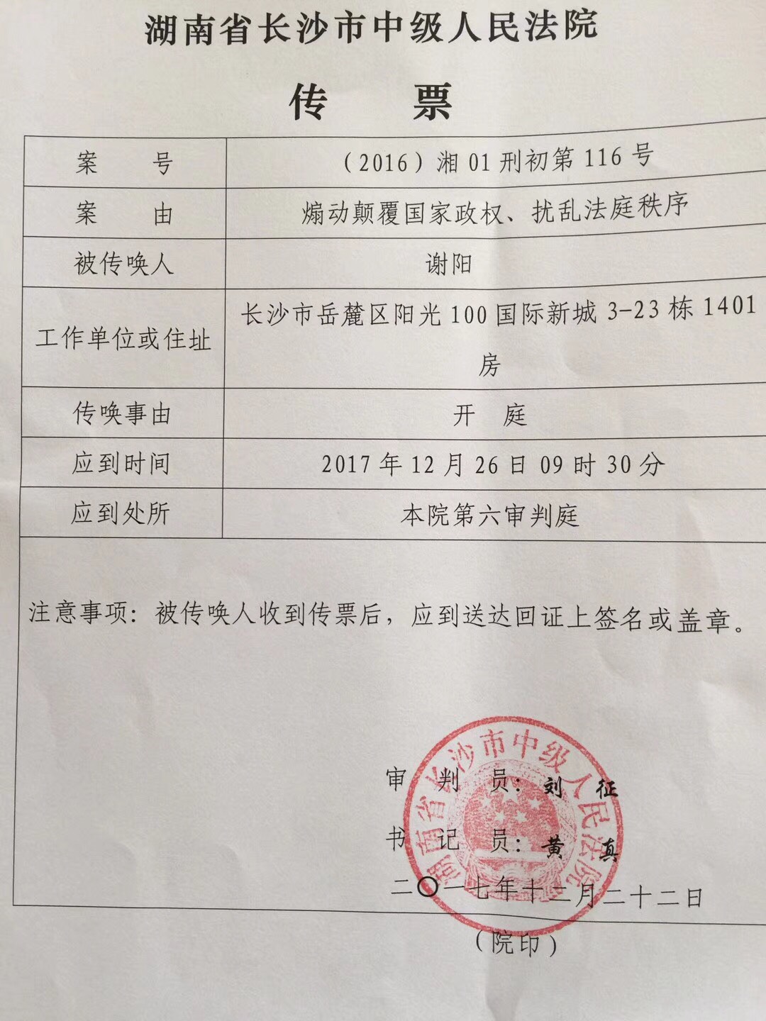 据悉,谢阳律师今天收到长沙市中级法院的传票。传票显示,谢阳所涉的“煽动颠覆国家政权罪”以及“扰乱法庭秩序罪”将于12月26日上午九点半,在长沙市中级法院第六审判庭开庭,除此之外并无提及其他事项。有分析认为,“谢阳案”此次重新开庭,有很大的可能是对该案进行宣判。“谢阳案”曾于今年5月8日开庭审理,其后谢阳被以取保候审的方式释放,但当时并未自由,仍然由有关部门限制人身自由,软禁、旅游长达四个月,至9月份以后才获一定程度的自由。