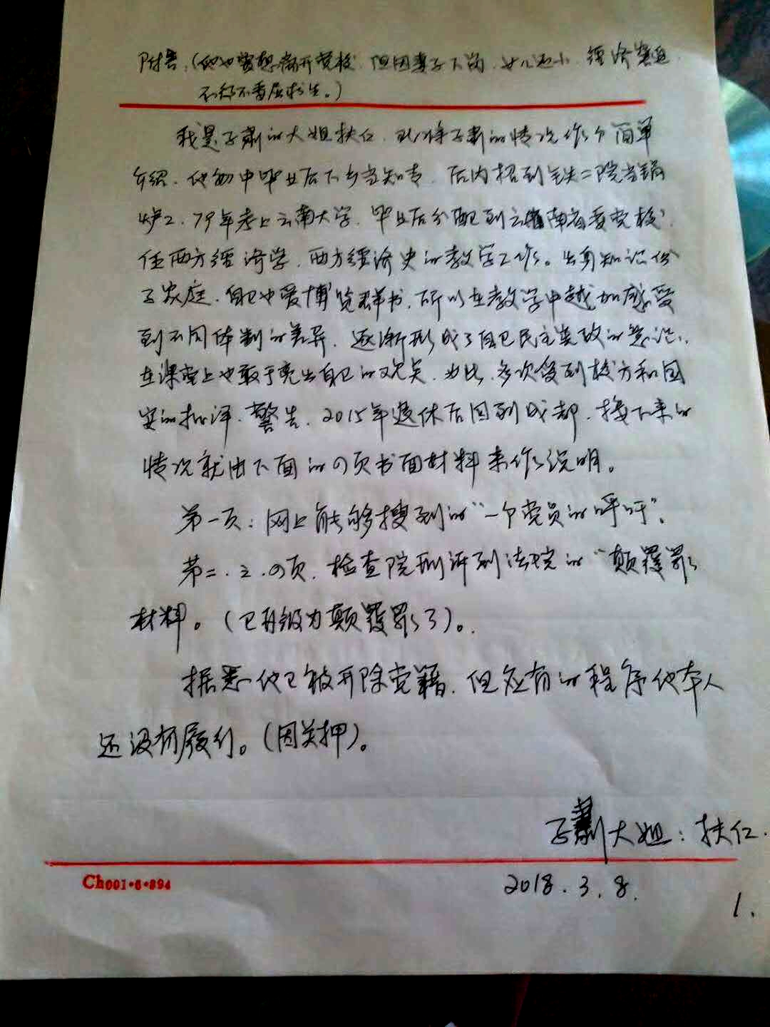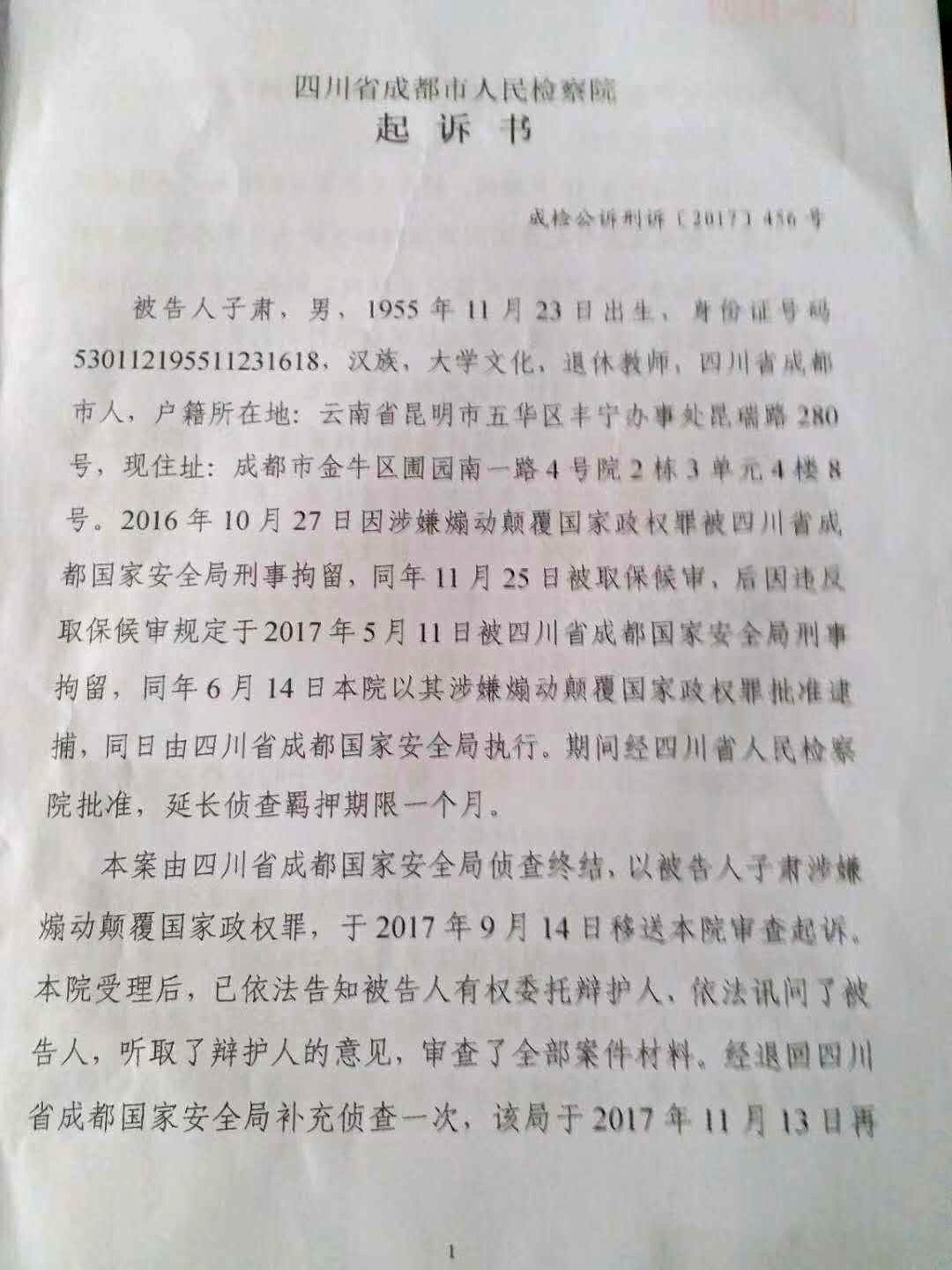 【民生观察2018年3月9日消息】今天,被四川成都当局以涉嫌“煽动颠覆国家政权罪”逮捕的云南党校教师子肃的姐姐子平(网名:扶仁)告诉本网人权观察员,近期子肃的律师前往四川成都看守所会见了子肃,律师告诉子肃的姐姐说,他已经收到了成都检察院发来的正式起诉书了,现在可以证实,子肃的罪名确实已经由“煽动颠覆国家政权罪”变更为“颠覆政权罪”。据律师透露,子肃目前在看守所里的精神状况还可以,但是人却有些消瘦。