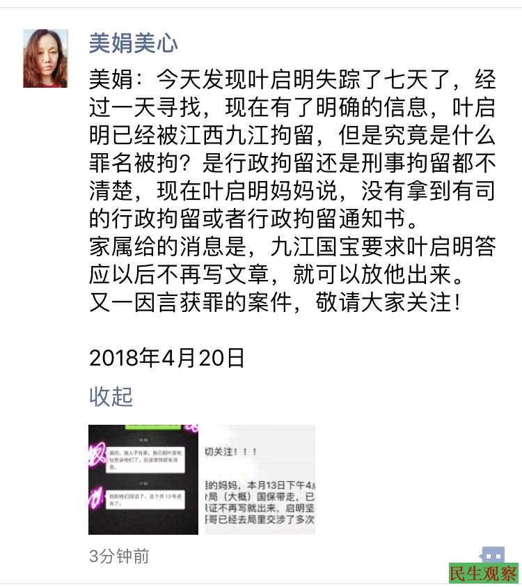 另据深圳网友黄美娟介绍,叶启明是她江西九江的老乡,也是江西优秀的民主写手,因长期在网络上发表,具有独立思想和见解的文章,此前曾多次被九江国保谈话喝茶。最近一周,她突然发现叶启明两部电话都关机了,发信息也没有回复,微信朋友圈已经七天没有更新了,遂联想到之前被国保频频喝茶,所以担心叶启明出了问题。于是,她便在网上发动江西同城网友寻找,终于在4月20日联系到叶启明家人,证实叶启明于本月13日下午四点,被九江市国保从家中带走刑拘,但警方未给家属留下拘留通知书。