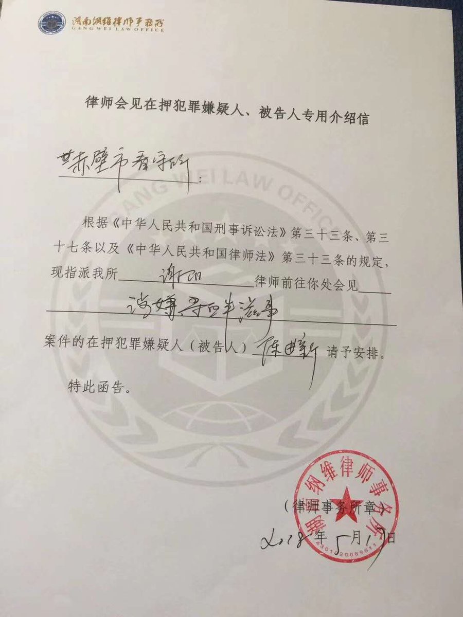据谢阳律师介绍说:“2018年5月17日(今天),我来到湖北赤壁市看守所会见因涉嫌寻衅滋事罪被羁押的陈进新(陈建雄)时,被告知不能会见。问其理由,王所长说是因为陈建雄在我被羁押(谢阳律师在2015年7月因煽动颠覆国家政权遭到羁押)期间,伙同他人去长沙围观我的案件开庭,我有可能与他案件有牵连,故禁止我会见。呵呵!有点意思,我也被成为嫌疑人了。”