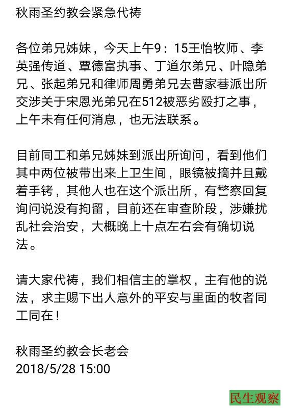 【民生观察2018年5月29日消息】本网获悉,昨天成都秋雨圣约教会的王怡牧师、李英强传道等人,前往成都曹家巷派出所就传道人宋恩光被恶劣殴打一事进行交涉,后被派出所扣留审讯长达十五个小时,目前未有任何消息,也联系不上他们。