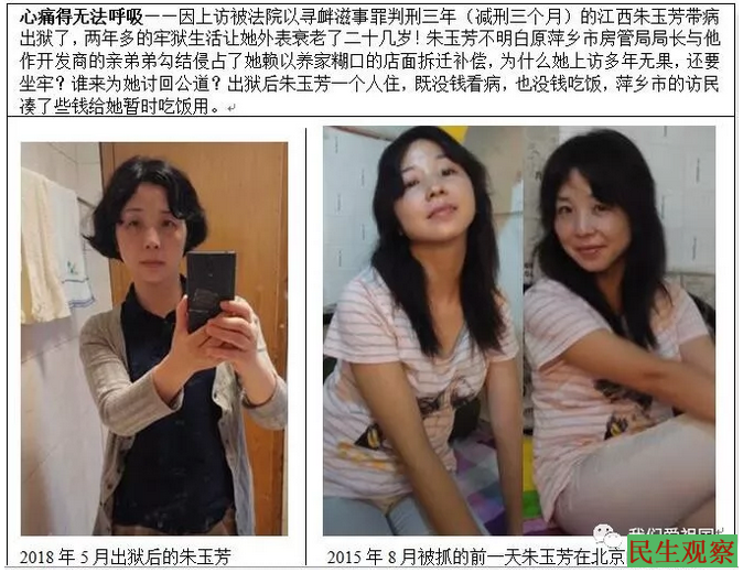 【民生观察2018年6月2日消息】江西访民朱玉芳因进京维权于2015年8月26日被警方抓捕,2016年11月14日朱玉芳被江西省萍乡市安源区法院以“寻衅滋事罪”判处有期徒刑3年,刑期至2018年8月25日。2018年5月26日,朱玉芳因在狱中受虐患病,被提前三个月释放回家。