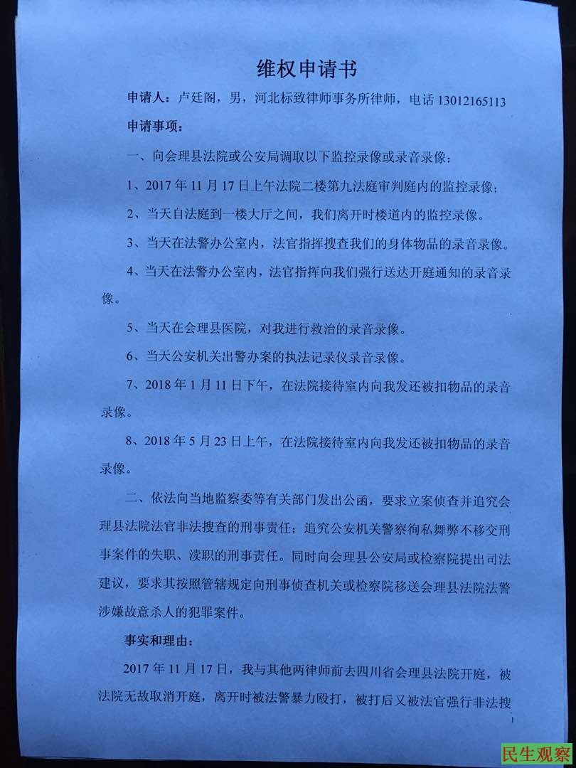 相关报道:维权律师卢廷阁在四川会理县遭法警殴打入院