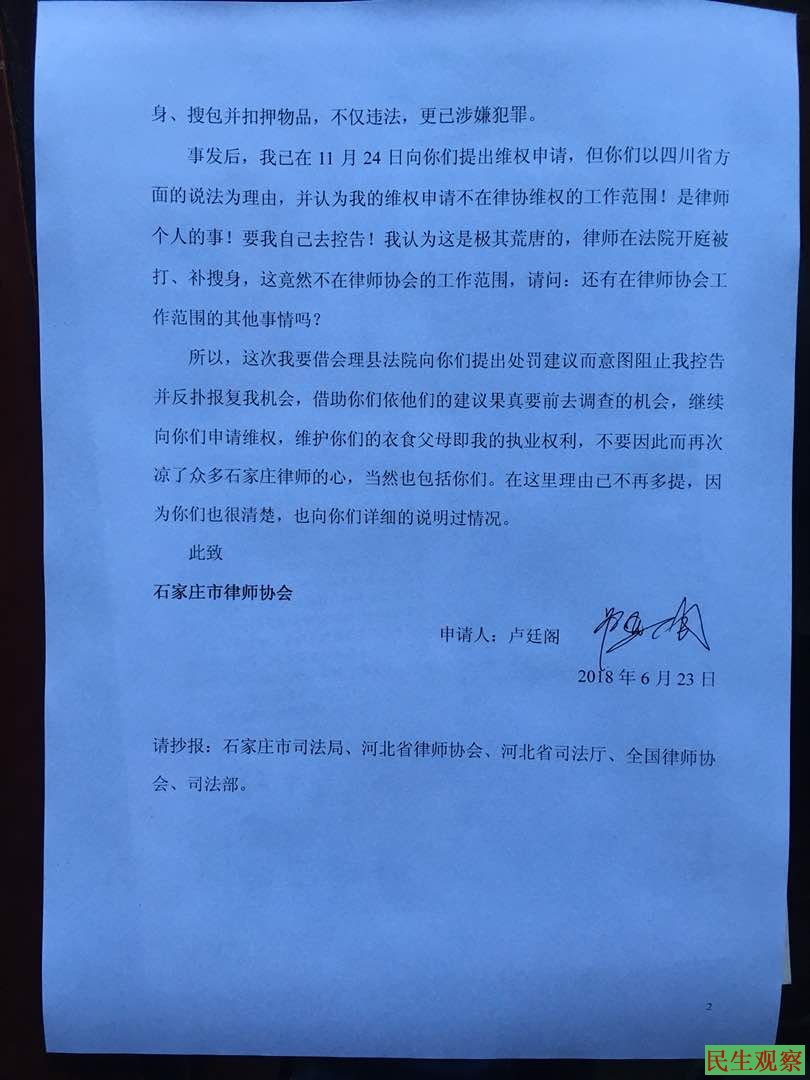 去年(2017年)11月17日发生被打事件后不久,卢廷阁律师曾向石家庄市律协提出了维权申请,律协在不理不问的情况下,以一份《反馈函》以“维权申请不在律协维权的工作范围”为由予以拒绝。6月23日,司法及律协组成的五人调查小组与卢律师进行会谈。期间,卢廷阁律师重新提出了维权申请,并申请调取法院现场、出警、医院等八处的监控或录音录像。