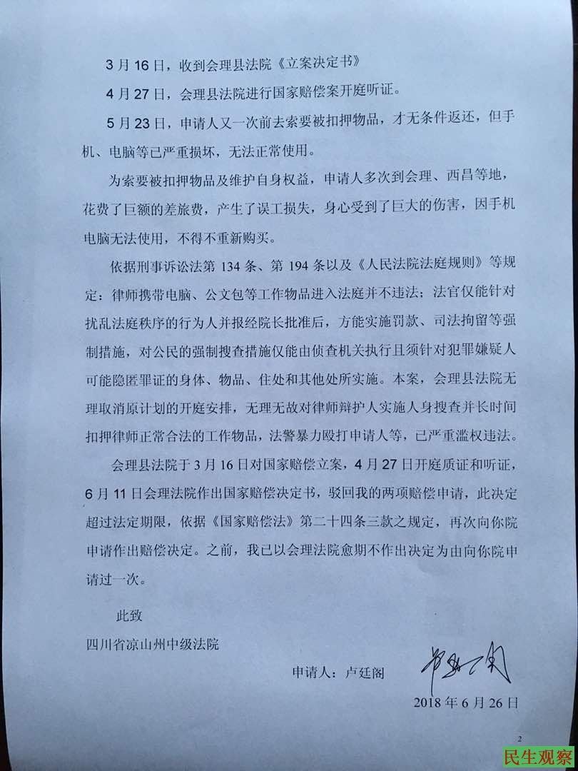 另外,卢律师透露,根据上次会理县法院驳回其提出的国家赔偿申请,此次将两份决定书一起附上,再次向凉山州中级法院申请国家赔偿,维权行动计划一步一步走下去。