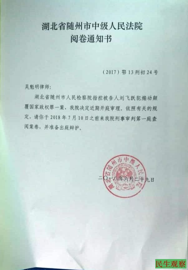 据刘飞跃的辩护律师吴魁民消息,近日他收到湖北省随州市中级人民法院的“阅卷通知书”,通知他于2018年7月10日之前到该院刑事审判第一庭查阅案卷,并准备出庭辩护。今天下午,辩护律师又收到随州市中级法院通知,刘飞跃涉嫌煽动颠覆国家政权罪案定于2018年7月10日9时在随州市看守所召开庭前会议。