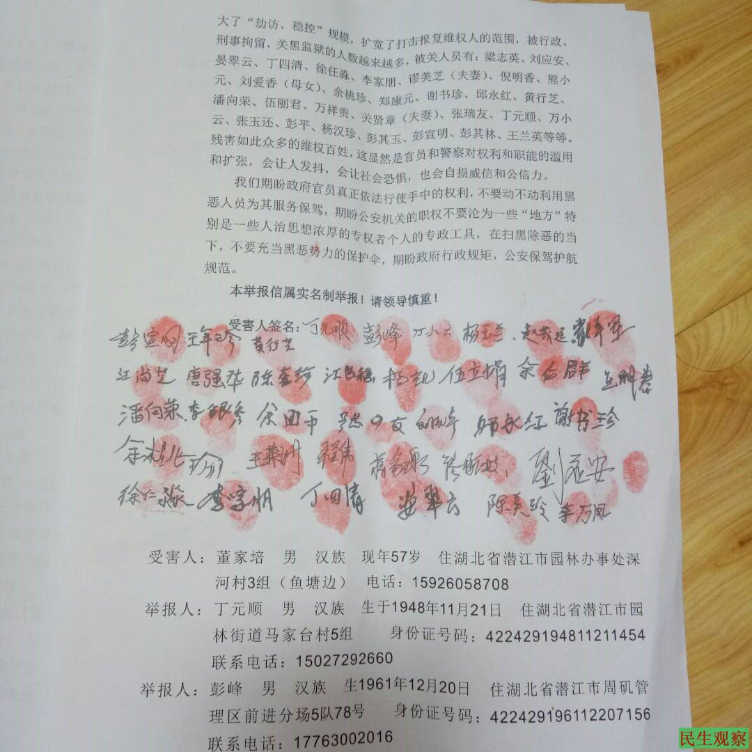 据悉,潜江维权人士彭峰、万小云、丁元顺等人曾以独立参选人的身份参加选举遭抓捕,其中彭峰被判刑一年零四个月;万小云被取保候审一年后再次被潜江公安局送检察院起诉,半年后检察院给予不予起诉;丁元顺关押一个月后被取保候审。被强拆户访民陈喜珍、黄金芳两姐妹、失地农民彭其玉,张玉还,彭宣明,彭平、计生绝育手术失败受害者万小云,余桃珍、李万凤、陈美玲、杨汉珍等人均以独立参选人的身份要求过参加选举。