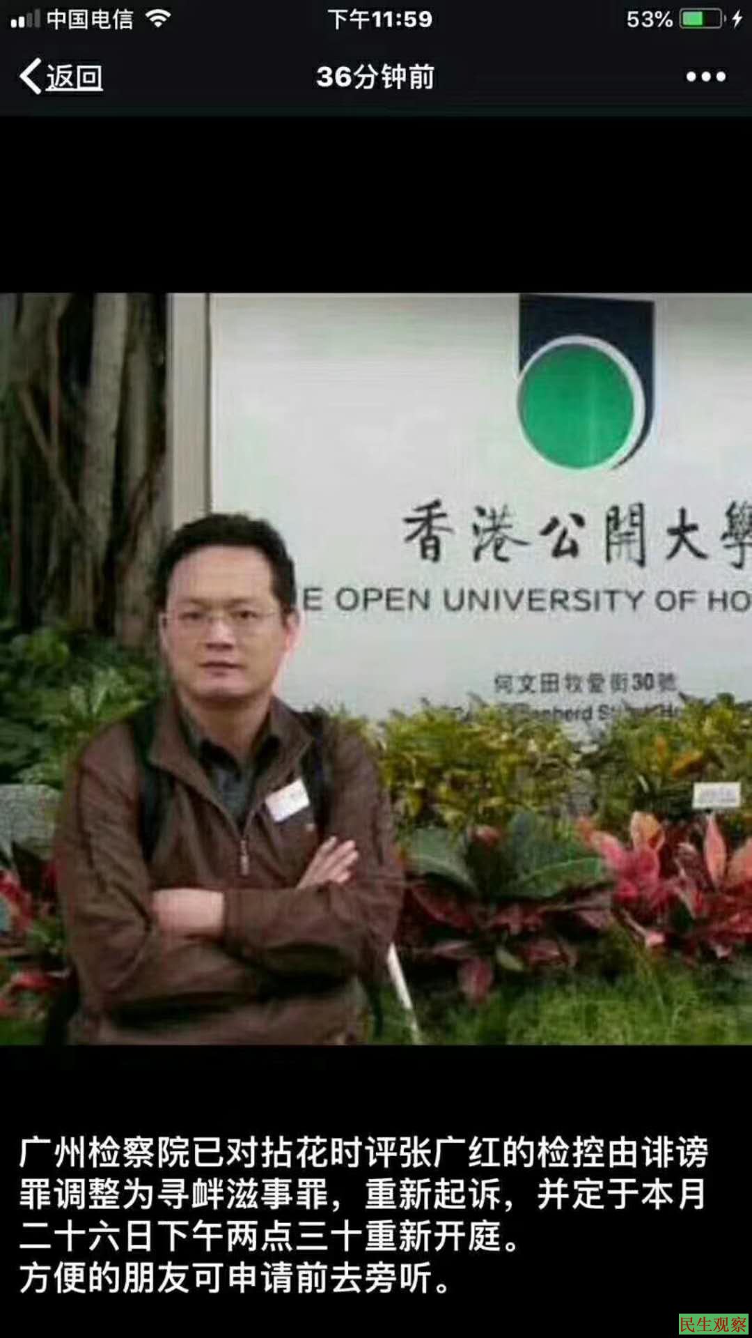 【民生观察2018年7月17日消息】本网获悉,广州拈花时评群主张广红,日前被广州检察院由诽谤罪调整为寻衅滋事罪,重新起诉,并定于7月26日重新开庭。
