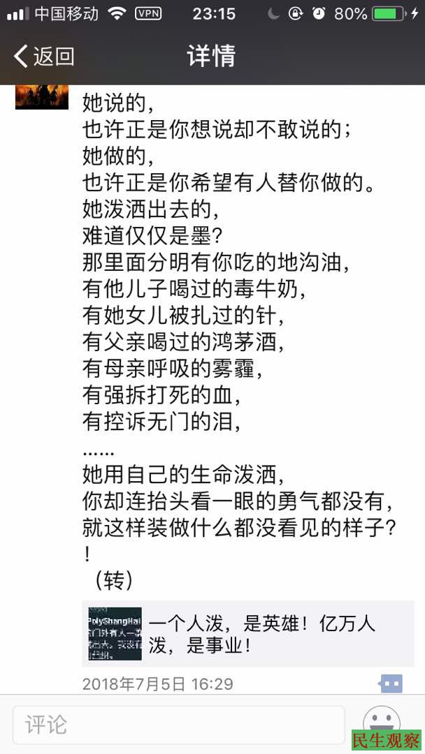 【民生观察2018年7月17日消息】本网获悉,湖南籍女孩董瑶琼,因在上海泼墨习近平画像遭当局抓捕,其父亲董建彪与维权艺术家华涌亦被抓捕,今获悉华涌被国保带走旅游,董建彪则被湖南邵阳当局带走后失联。另悉,新浪博友伊布(网名)因撰写《一个人泼,是英雄!亿万人泼,是事业!》的文章声援泼墨女孩董瑶琼遭“喝茶”。
