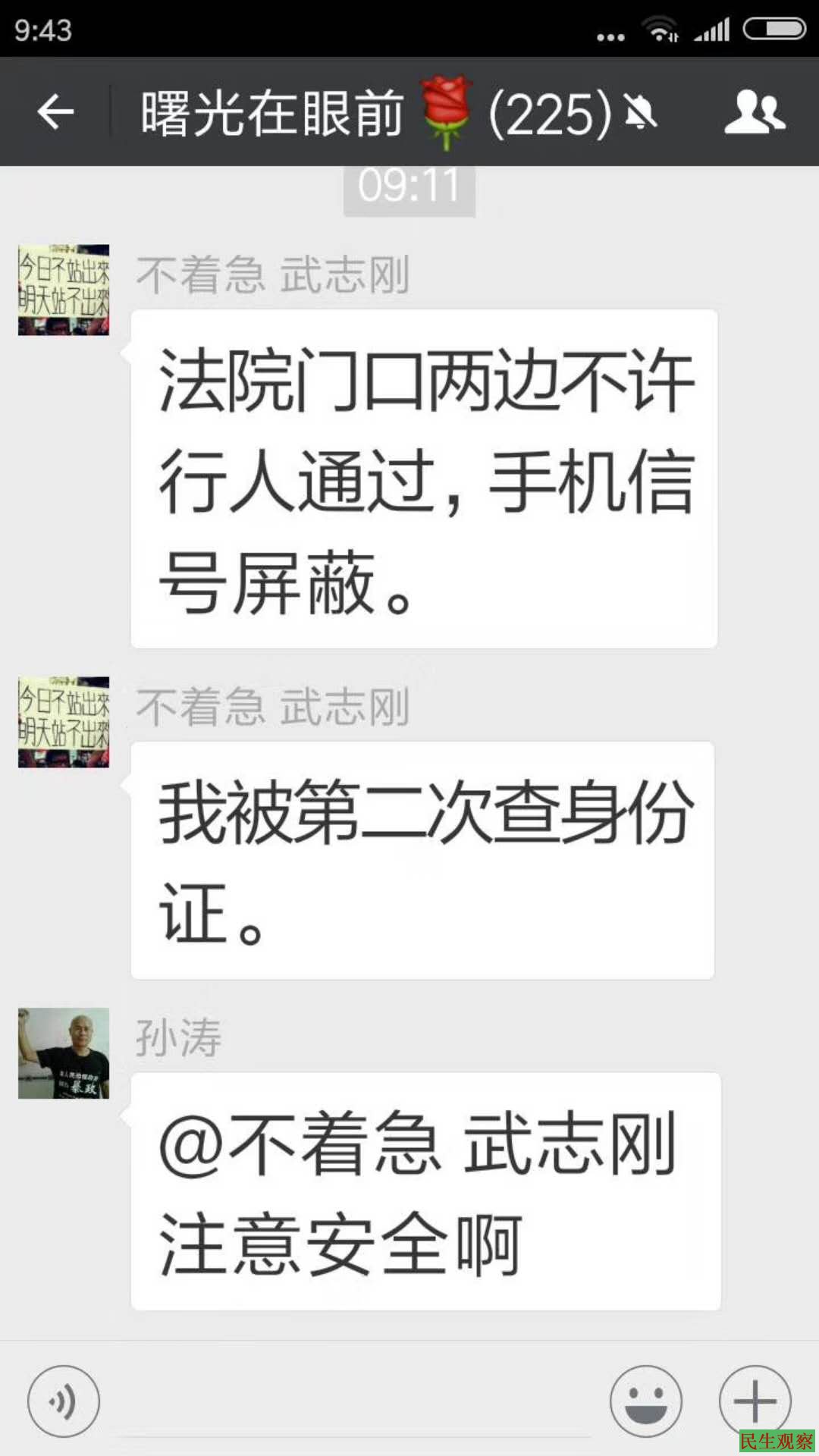 湖北武汉网友高新(网名:杉杉)发出消息称:“我今天早上4点起床,5点上火车,7点多一点就到随州了。8点多一点,我刚来到随州中院大门口,就被现场一大帮警察围起来并要求查身份证,在我递身份证的时候,另外一个警察(没警号)直接在我口袋里掏手机,抢了过去,我被押上警车,送进派出所关押,并将身上所有物品扣押,包括打火机、烟、茶杯等都扣留了。我是第一个被抓进派出所的。进去以后,警察一边和我聊天一边等随州国保来人,谈完话做完笔录,约10:40分我坐上派出所的警车,被押到随州火车站,上了开往武汉的火车。随州警察可真是尽心尽责呀,他们在亲自看到我上车,并且火车开动以后才离开。下午一点到汉口站,然后和山西的武志刚一起去高铁站,见到湖南株洲的何家维,又返回,于今天下午4点半才回到家。”