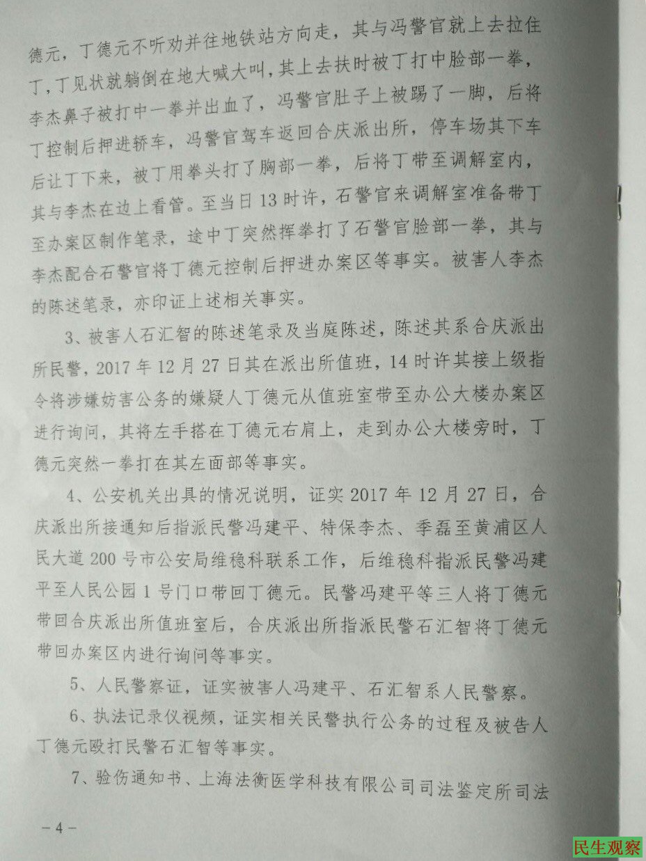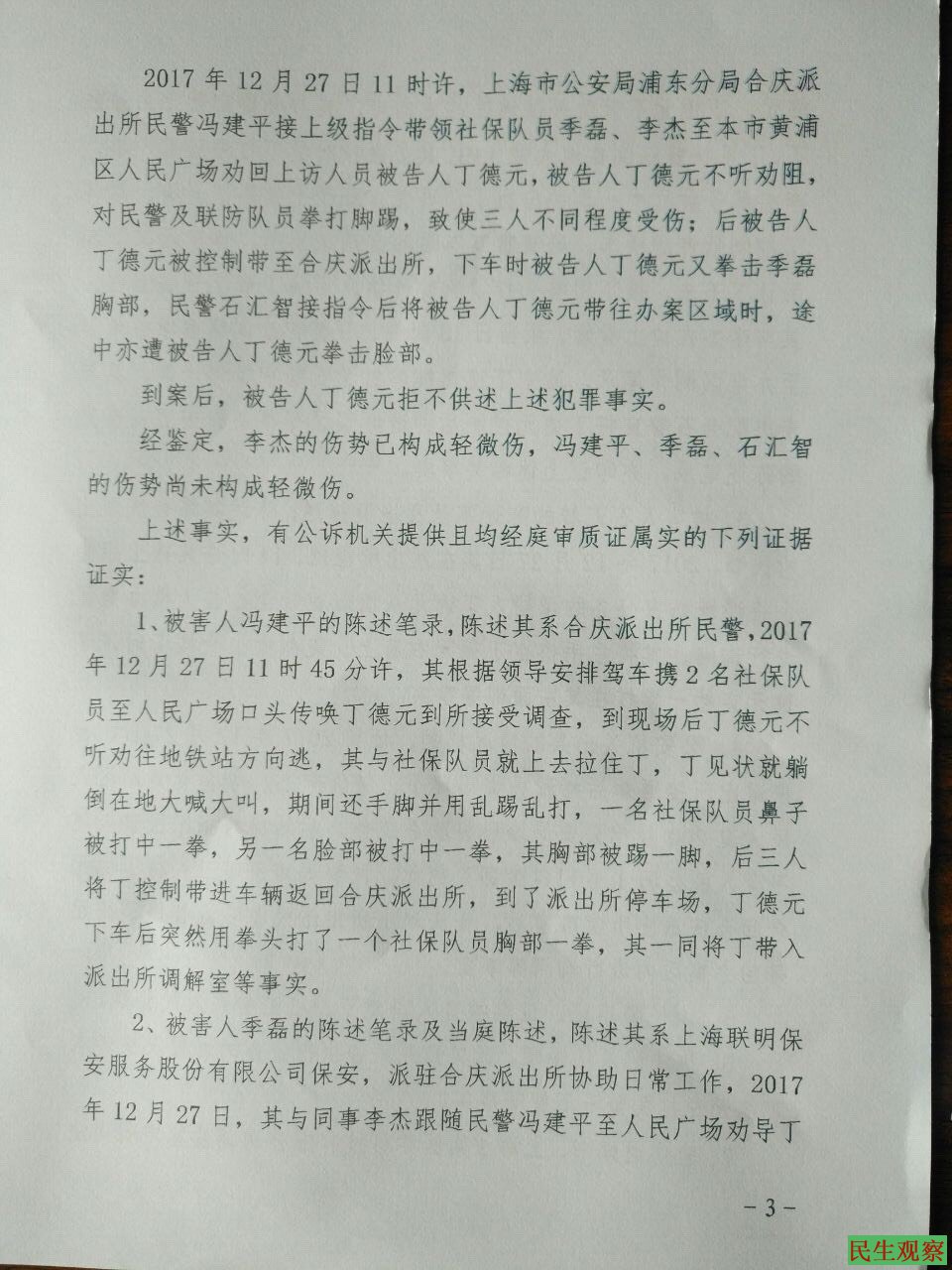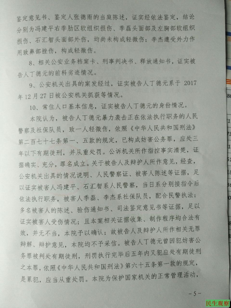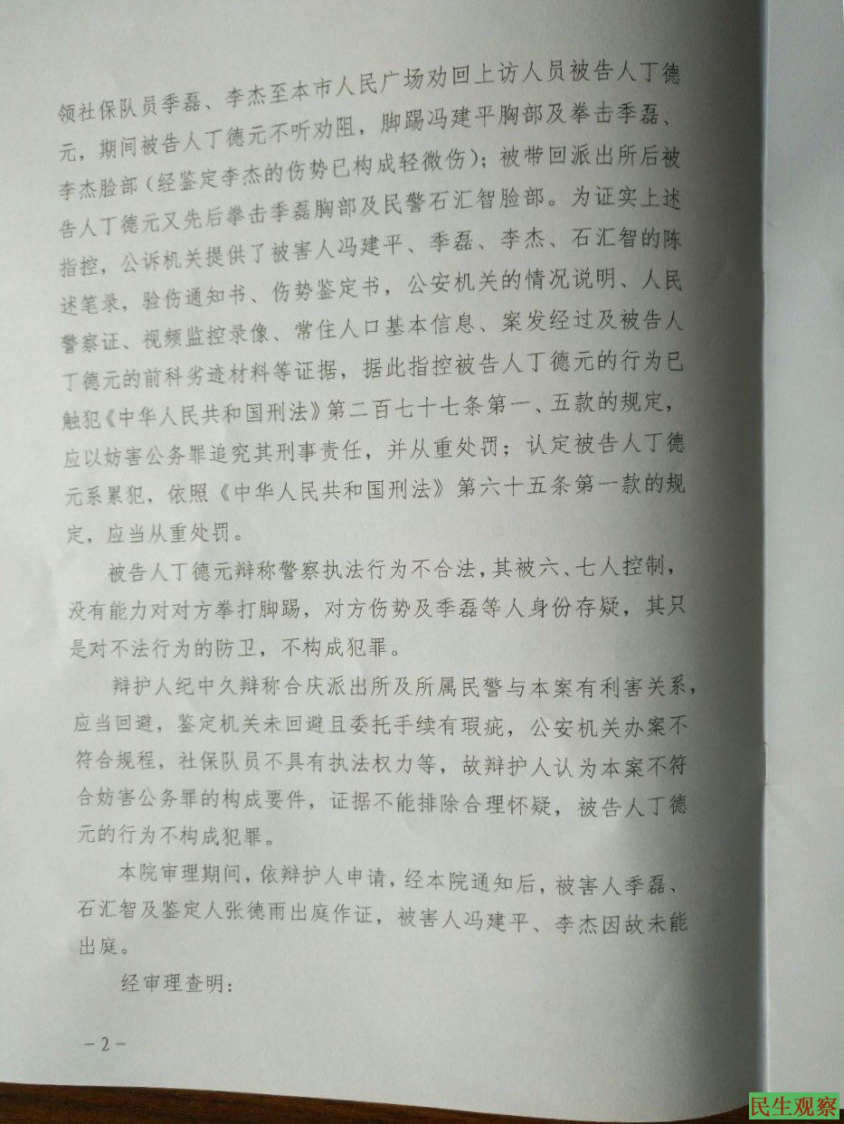 根据法院的判决书显示,2017年12月27日,浦东警方派出警务人员及社保队员前往人民广场劝回上访人员丁德元,指控丁德元对警员及社保队员进行拳打脚踢,导致几名地方维稳人员有不同程度的受伤事实,经鉴定属于轻微伤,根据《刑法》相关规定,丁德元涉嫌“妨害公务罪”,并且由于丁德元具有犯罪前科,因此根据相关法律规定必须从重处罚。