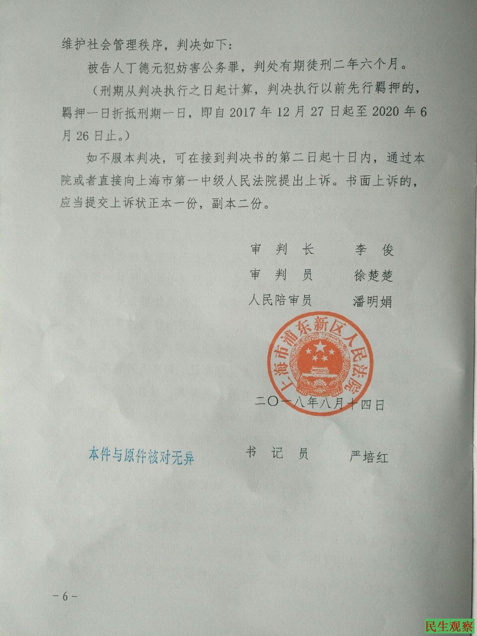 【民生观察2018年8月22日消息】近日,上海维权访民丁德元被控“妨害公务罪”一案在上海市浦东新区看守所宣判,丁德元获刑两年零六个月,刑期自2017年12月27日起至2020年6月26日止。该案于2018年7月25日在浦东新区法院第一庭开庭审理。丁德元此次因维权获刑已是两年内的第二次,上次(2016年10月24日)被浦东新区公安分局控以同样罪名获刑一年零两个月,2017年12月23日刑满释放,12月27日,丁德元再次被浦东分局以“妨害公务罪”抓捕,半个月后批准执行逮捕。