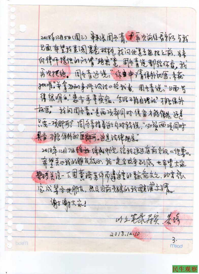 2018年12月5日周三,审判长周冬青再次前往看守所与我见面,希望我查阅案卷材料,我问他是否包括之前未向律师提供的的所谓的“绝密“卷,周冬青说都给你看,我再次拒绝。周冬青还说,:”你申请保外就医,未荻批准。“ 并拿出刑事诉法给我看,周冬青说:”上面写得很明白,患有严重疾病,生活不能自理的“才能保外就医”。我问周冬青“是两项都同时俱备才能保外,还是只要一项即可?” 周冬青指着这个对我说‘必须两项同时具备才能保外就医,这是法律规定。 “