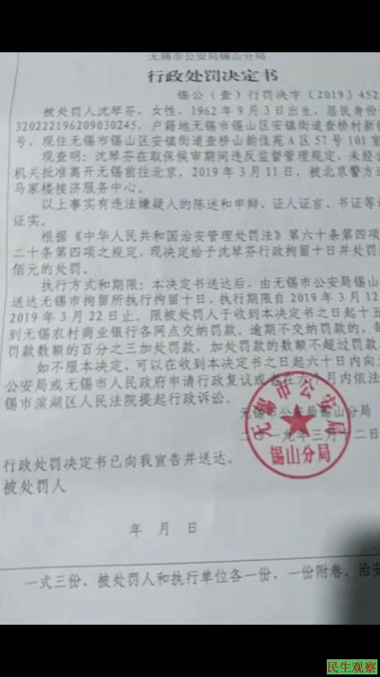 六、江苏省无锡访民沈琴芬在两会期间前往北京,于3月11日被北京警方抓住送往马家楼接济服务中心关押,3月12日沈琴芬被押回当地后,被无锡市公安局锡山分局行政拘留10天,现关押在无锡市拘留所。