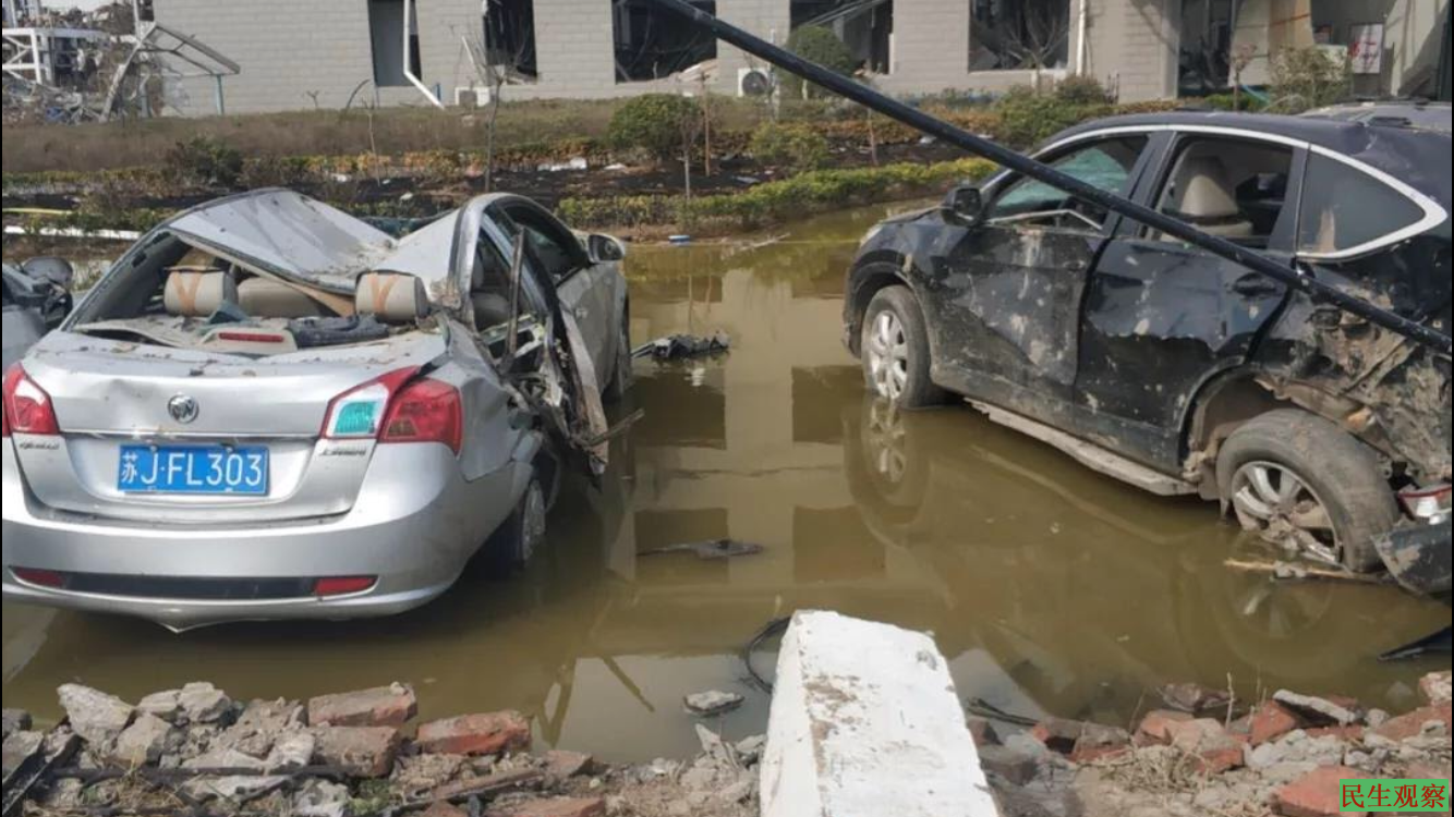 工业园附近村庄房屋受爆炸影响门窗被炸飞,玻璃被震碎,有些房屋屋顶震塌,很多人被飞溅的玻璃刺伤。陈家港工业园在最近几年完成了园区边界与居民区500米安全卫生防护距离的拆迁,如果安全卫生防护距离没有完成拆迁,恐怕居民区的伤亡和损失会严重很多。从这次事故也可以看出,面对化工厂爆炸500米到4千米都不一定安全。若是在下风向,有毒气体更不知会飘散多远。国内很多工业园有园中村问题,为了安全,先把这500米安全卫生防护距离拆出来是正确的选择。