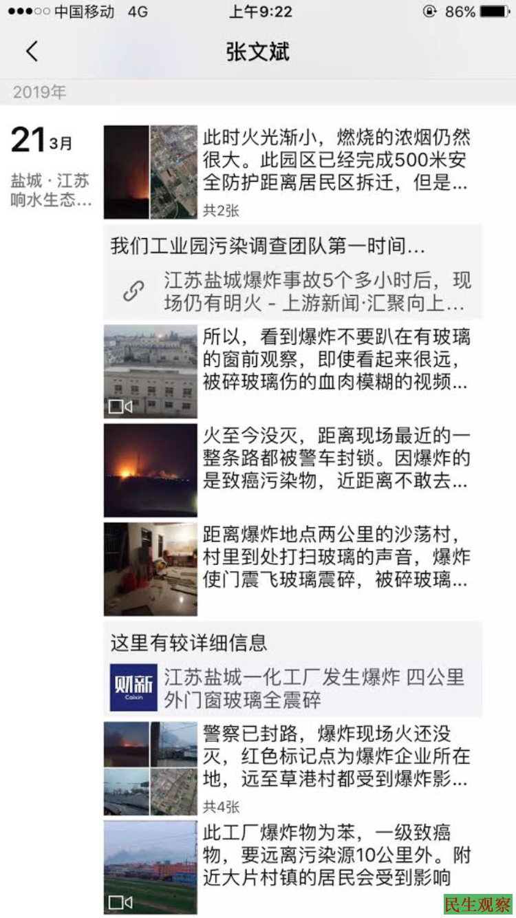 据悉,“3·21”响水化工厂爆炸事故发生后,牵动全国上下人民的心,大家一直在关注爆炸案人员伤亡情况、现场环境污染状况。张文斌是一名环保公益志愿者,事情发生后,不顾个人安危,和另外一名环保志愿者于当天下午在第一时间抵达了现场,观察事故现场环境污染状况,并为现场的难民提供污染防治建议。