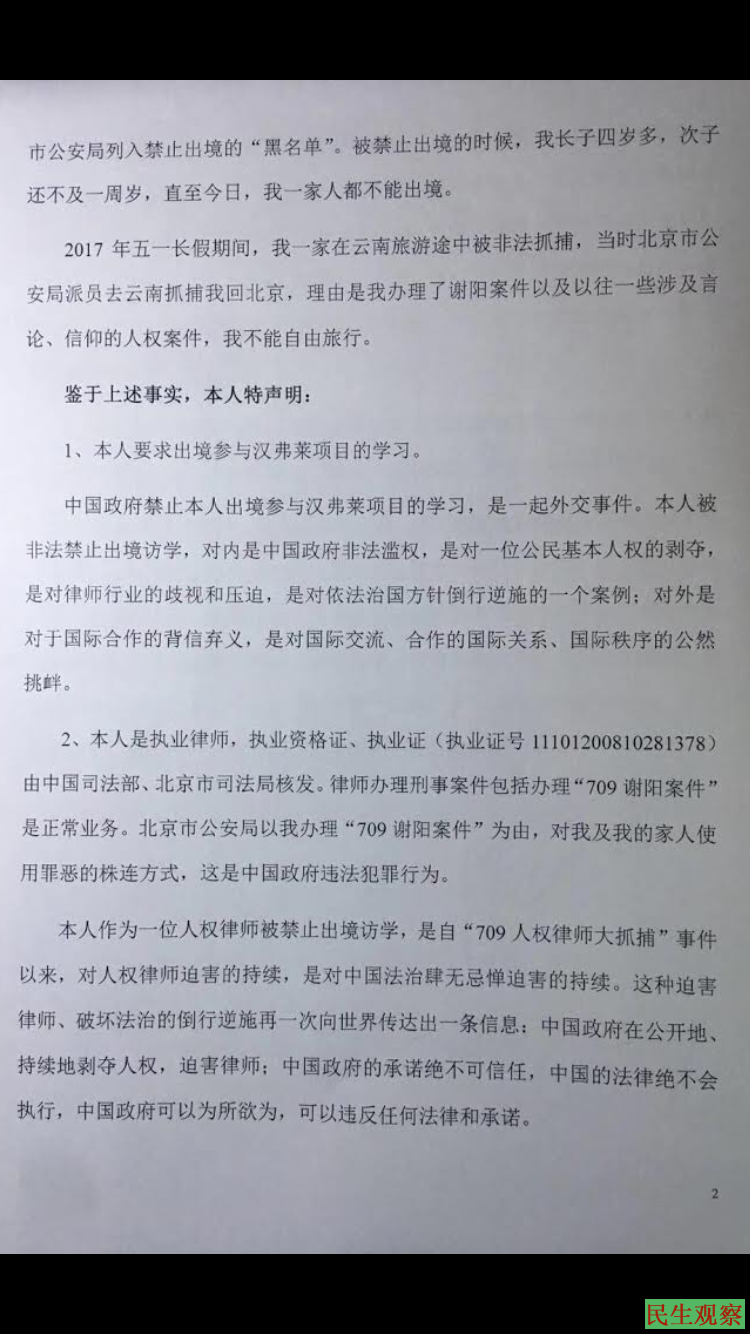 出境受阻后,陈建刚律师随即发表声明,强烈要求出境参加汉弗莱项目的学习,表示作为执业律师担任辩护律师不应成为株连其及家人的理由,并重申,至今为止尚未有任何执法机关对陈本人立案,陈本人亦未触犯任何罪名,完全是无罪之身。