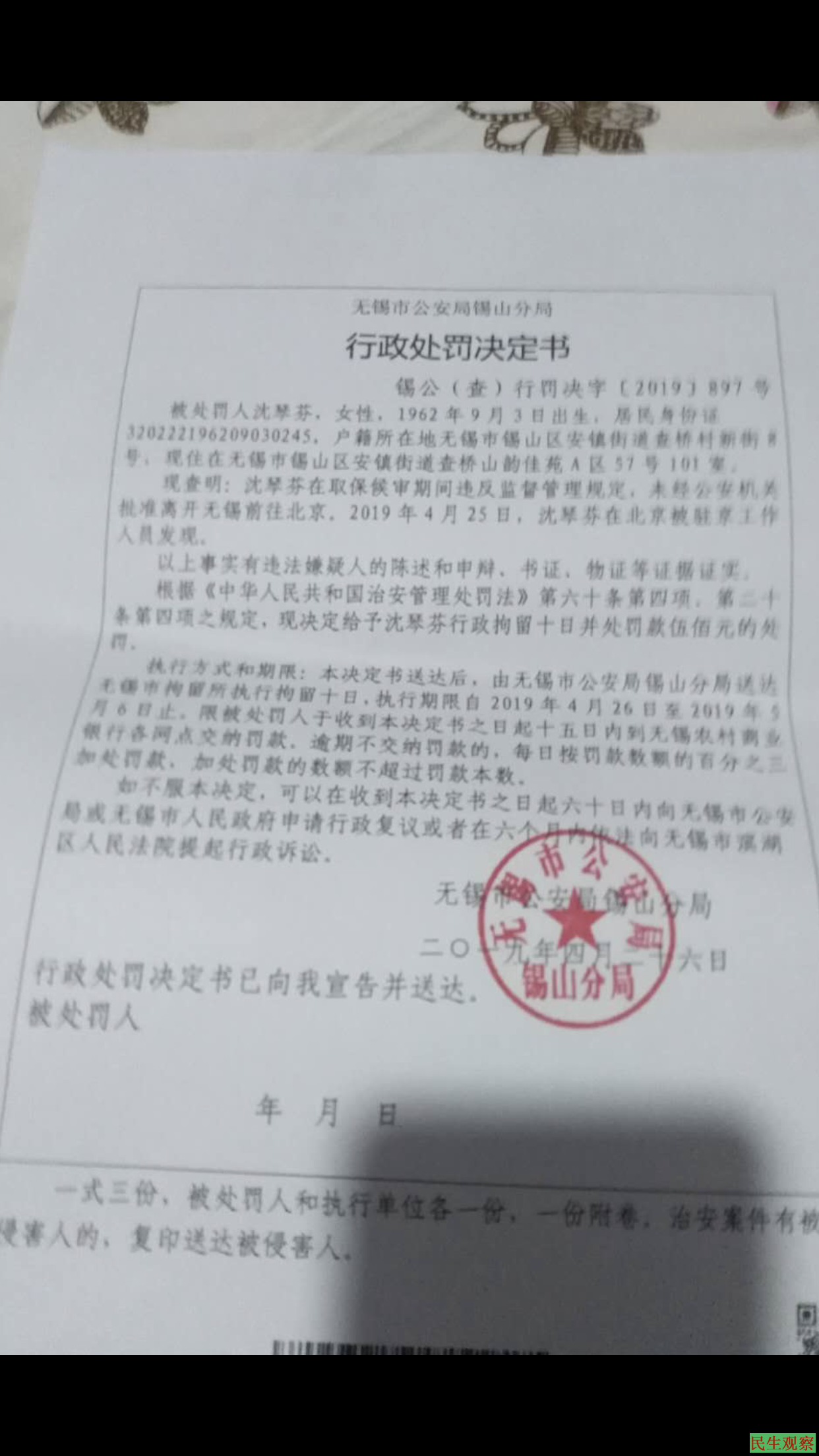 8、江苏无锡访民沈琴芬、倪满良、孙静芳三人于2019年4月25日前往北京反映诉求,被警方查获后送往驻京办关押,之后被带回当地三人分别被行政拘留10天。执行期限自2019年4月26日至2019年5月6日止。
