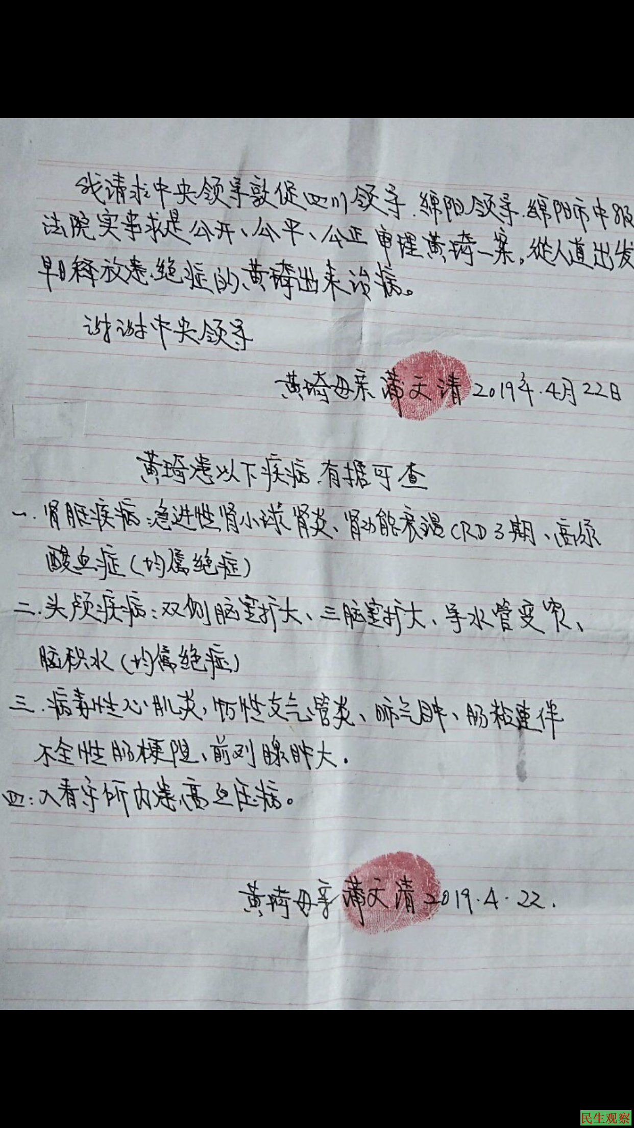 【民生观察2019年5月3日消息】因忧心罹患多种疾病的儿子黄琦遭遇不测,最近,86岁高龄的蒲文清老人写信给中央及多个政法系统部委,请求当局释放黄琦,以期尽快入院接受系统治疗,挽救生命。