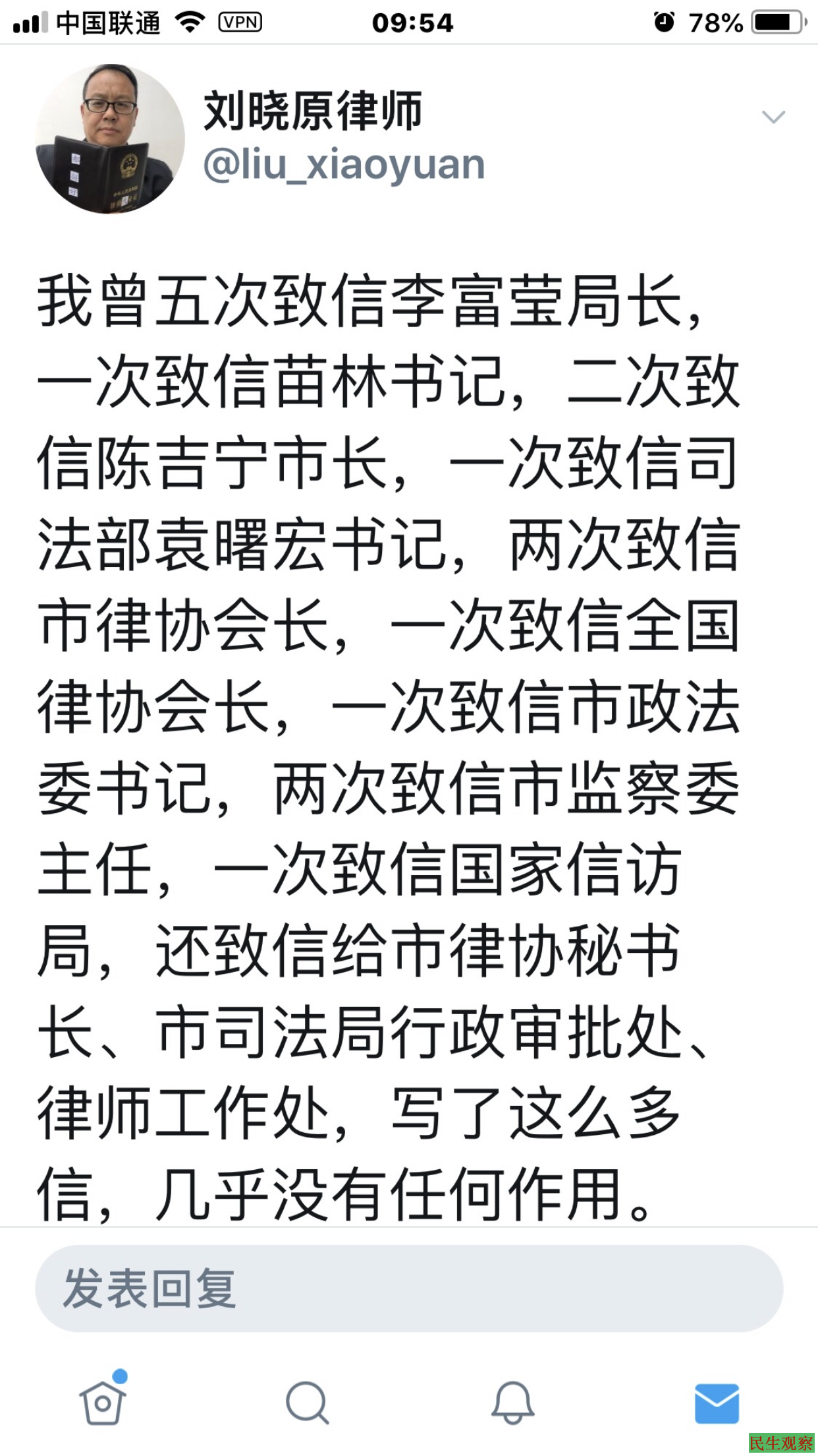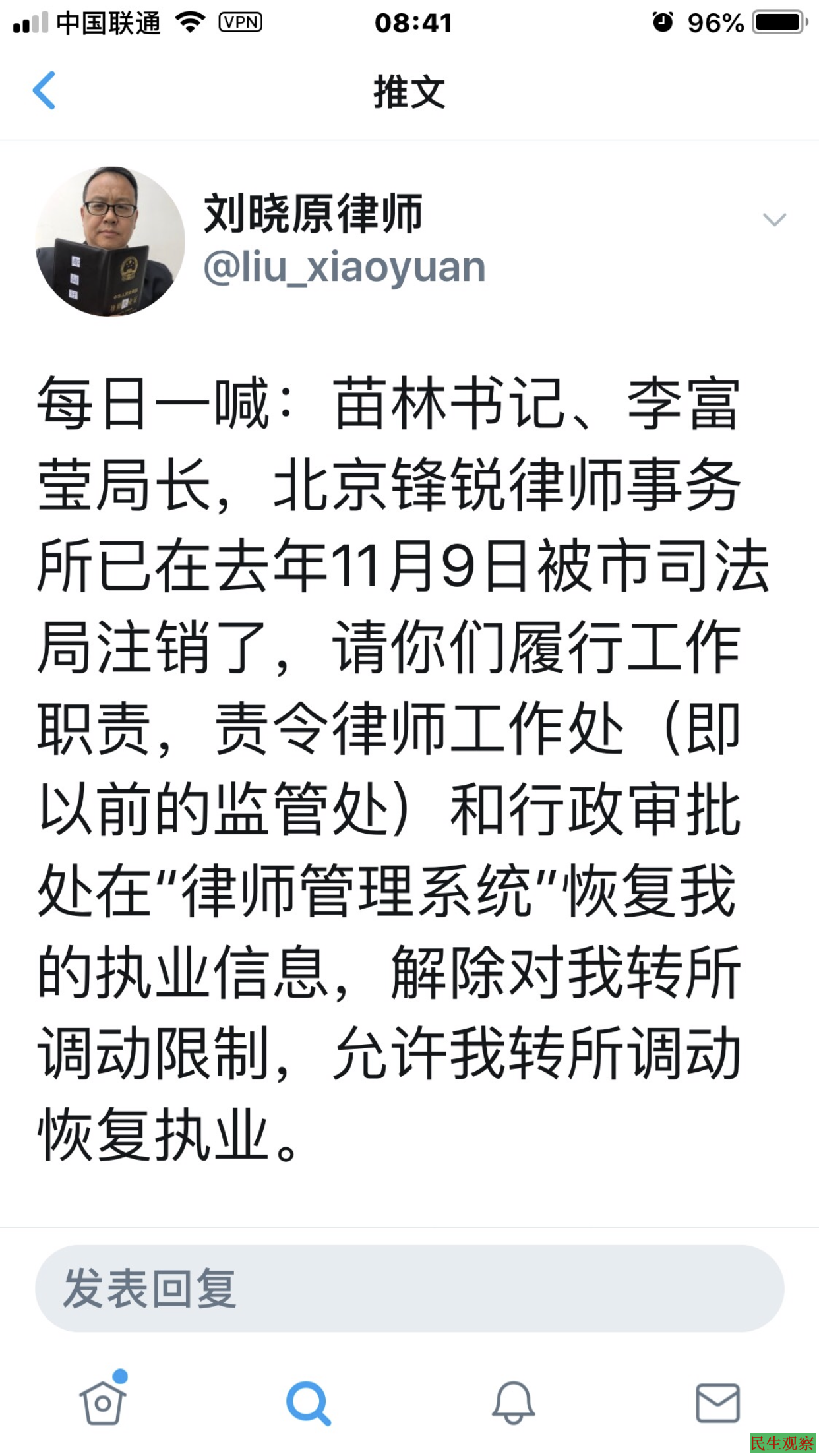 面对司法当局无动于衷的傲慢态度,刘晓原律师在春节后以“每日一喊”的方式在多个网络平台进行控诉,但毫无效果无人问津。同一时间,与刘晓原律师有同样遭遇的还有锋锐所另一合伙人周立新律师,二人均进退维谷,终因法规受限以及政治因素双双被卡,将面临注销律师证以及无法正常职业的局面。