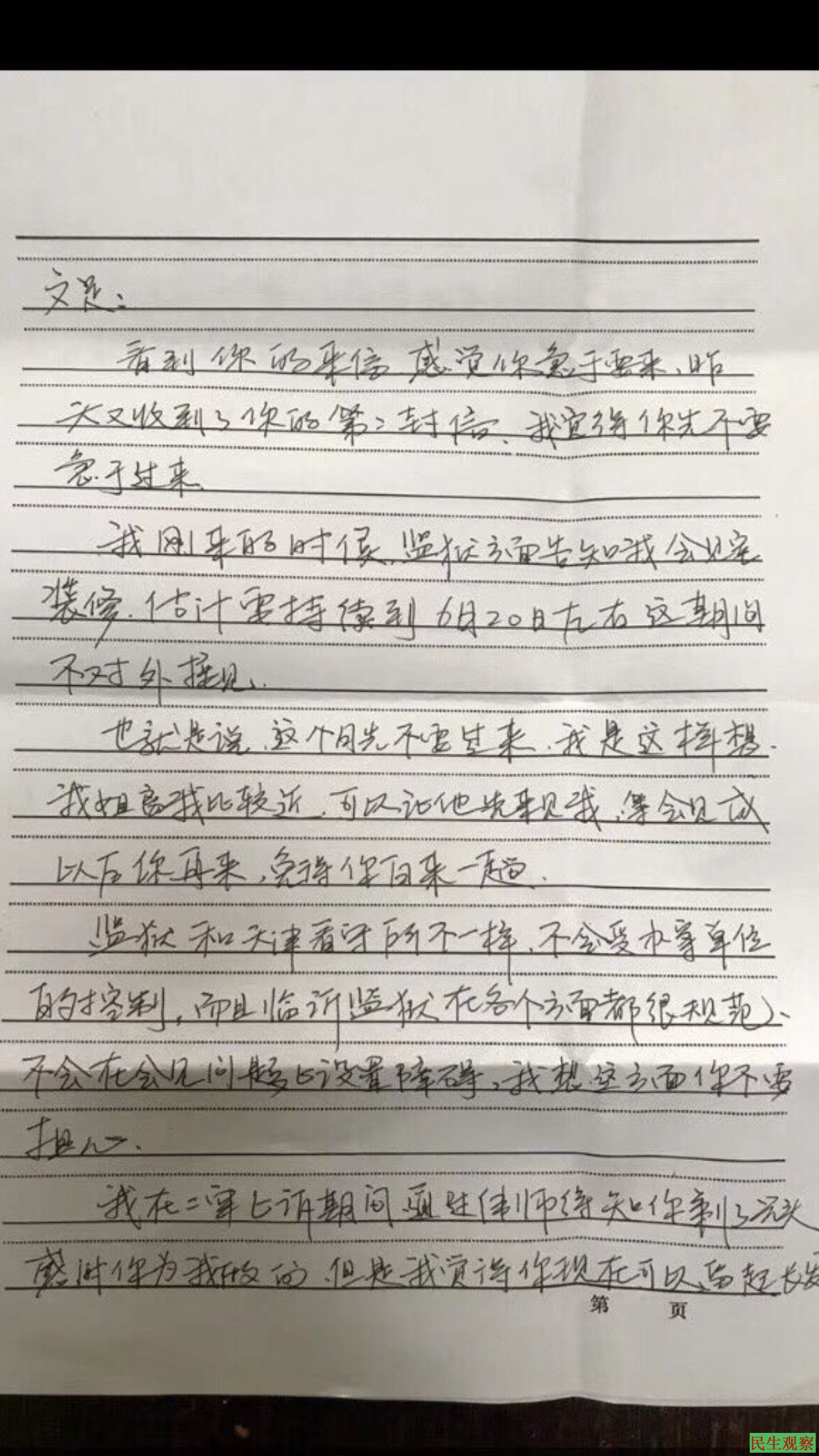 【民生观察2019年5月13日消息】自从4月29日王全璋被送至山东临沂监狱服刑以来,妻子李文足已经收到两封疑似王全璋本人的家书,但信件疑点重重,已经基本断定非王全璋本人所写。