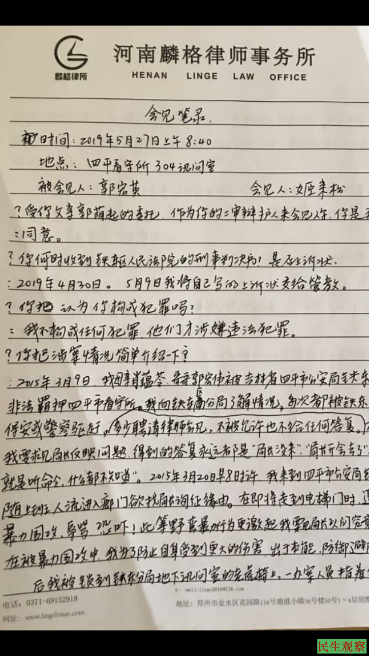2019年5月27日,上午8点姬来松律师到看守所会见了被判刑的郭宏英女士,郭宏英女士向律师讲述了她家的冤案情况,她认为当局有意设局构陷涉嫌寻衅滋罪,这一切都是当局为了打击报复她们一家人而特定的”家庭套餐”一家三口入狱。