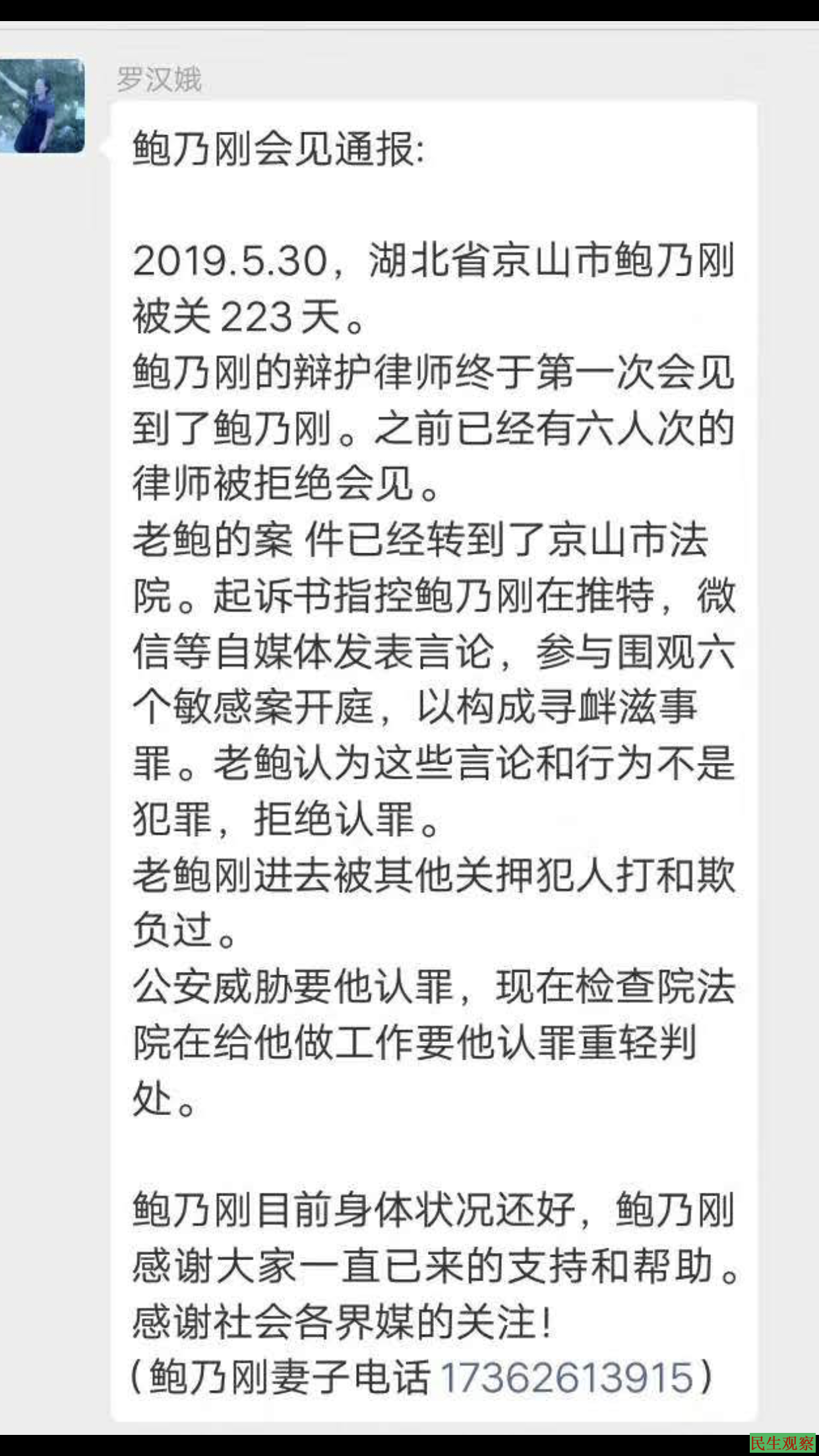 2019年5月31日,鲍乃刚的委托律师吴魁民,在反复与京山看守所及警方交涉后才获批会见。