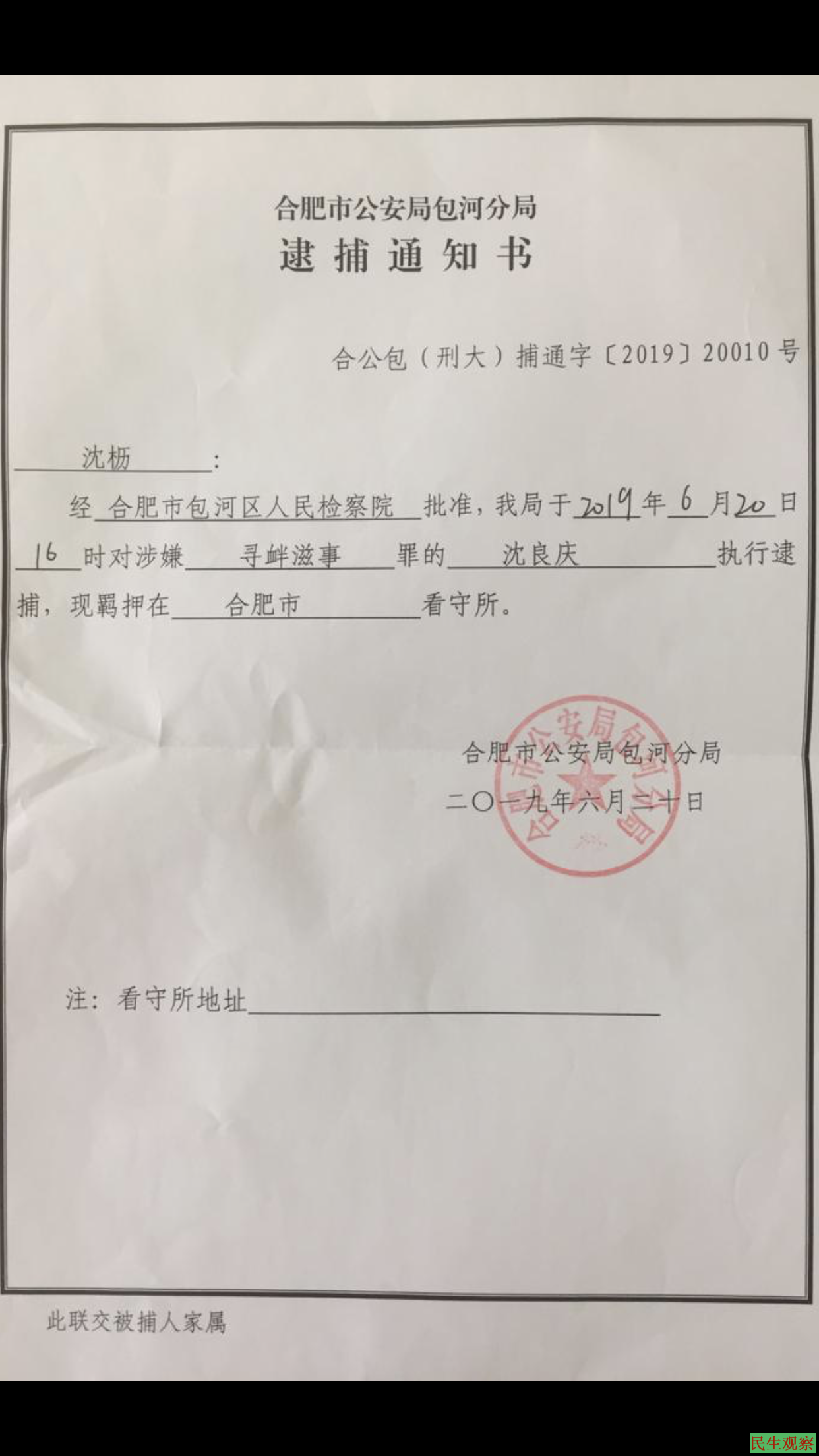 今天(6月25日)沈良庆家属收到了合肥市公安局包河分局邮寄来的《逮捕通知书》,确认沈良庆已在6月22日被当局以涉嫌“寻衅滋事罪”遭逮捕。