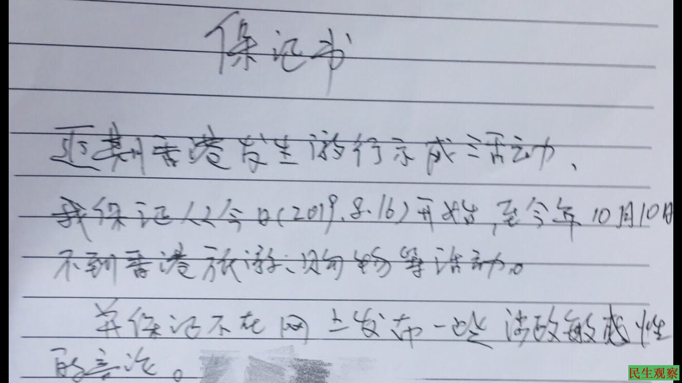 最后警方要求赖日福写下保证书,保证10月10日前不去香港旅游、购物以及参与活动,同时保证不在网上发布涉政敏感性言论(包括香港时政消息)。据知情人透露,警方要求赖日福写下保证书,但赖表示不愿意,最后由警员编写后让赖日福原文抄写并签名。