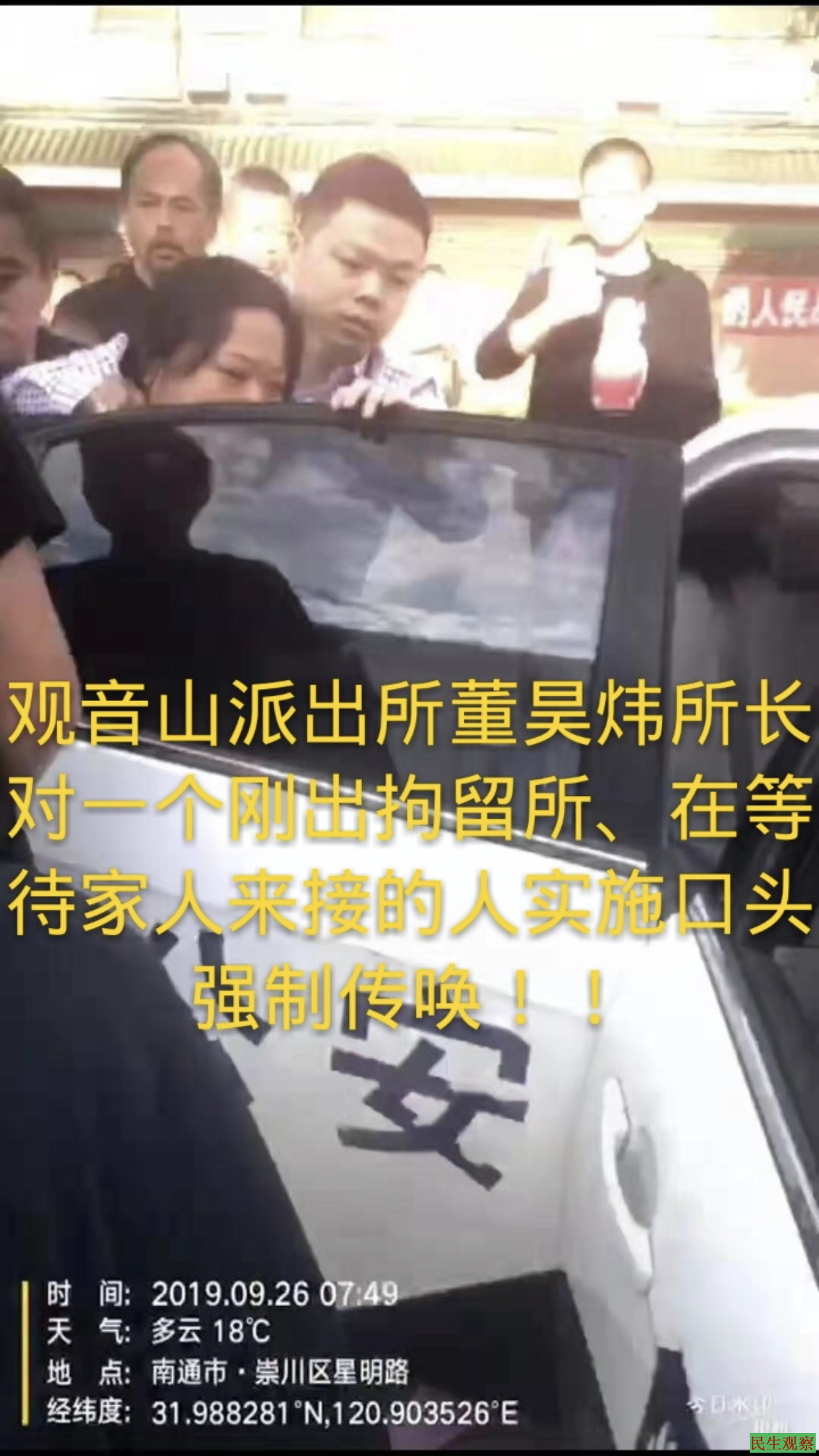 瞿华继续说“出拘留所大门后,我看到马路两边停着好多车,现场好几十人,有江海镇区工作人员、派出所民警及特勤人员、还有不明身份人员!我老公张金山已经出了拘留所在门口等着,他告诉我,他也被提前释放了,出来后也被强行要求坐他们的车被他拒绝!之后我们两人就一起站在拘留所的东大门等家人来接!大约7点40分左右,来了两名没穿警服、拒绝出示任何证件、也没有佩戴执法记录仪、开的车也不是警车的人,(27日得知穿格子衬衣人是观音山派出所所长董昊炜)走到我们夫妻面前,先询问我们是否是今天出拘留所的人,我们告诉他我们是的!他又问我们为什么站在这里?我们说在等家人来接。他说他送我们回去,我们说我们又不认识你,而且我们家人马上到了。他忽然对我们说对我们进行口头传唤!我们很莫名其妙问他口头传唤的理由,他根本不理我们,说如果我们不配合就强制传唤,之后这两个穿着便衣的人就强行将我们夫妻塞进了一辆后来开过来的警车上,并将我们送到南通市公安局崇川分局观音山派出所。之后对我以涉嫌“殴打他人”、 对张金山以“涉嫌阻碍执法” 做了询问笔录(均拒绝出具传唤证)。我们当天上午8点左右被带进观音山派出所,张金山下午4点左右被放出去,我到晚上9点半左右才被放出。”