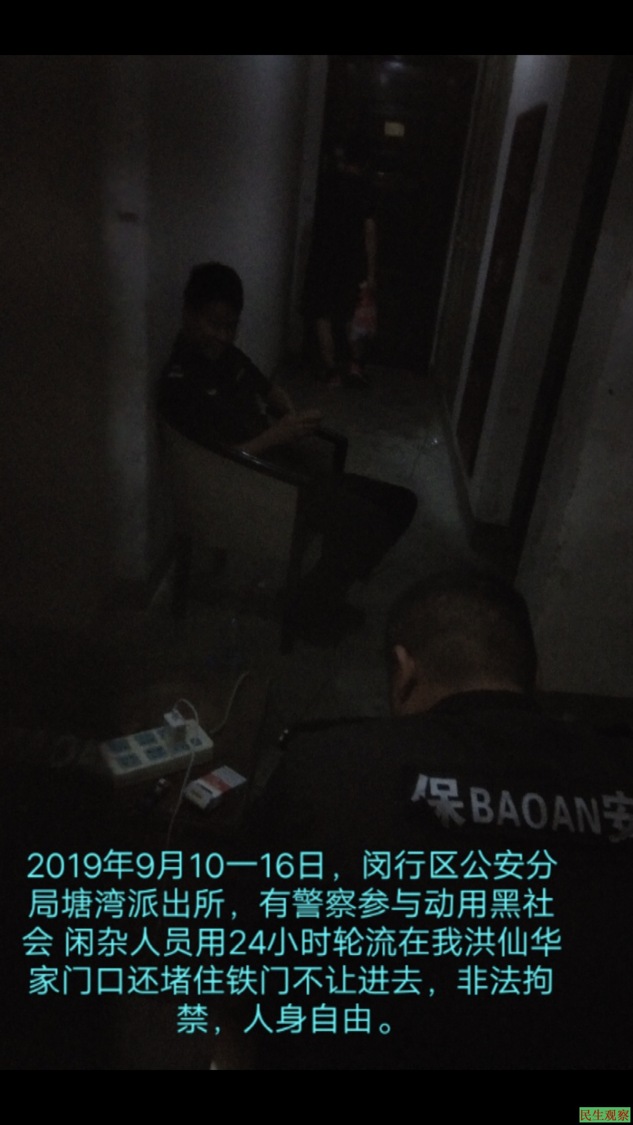 【民生观察2019年10月30日消息】上海闵行区访民洪仙华在国庆70周年期间,被当地部门非法拘禁限制人身自由,就连出门看病也不被允许,非法剥夺其生存权。洪仙华说,现在她家楼下的看守人员仍未撤离,每天对其进行24小时监视守候。
