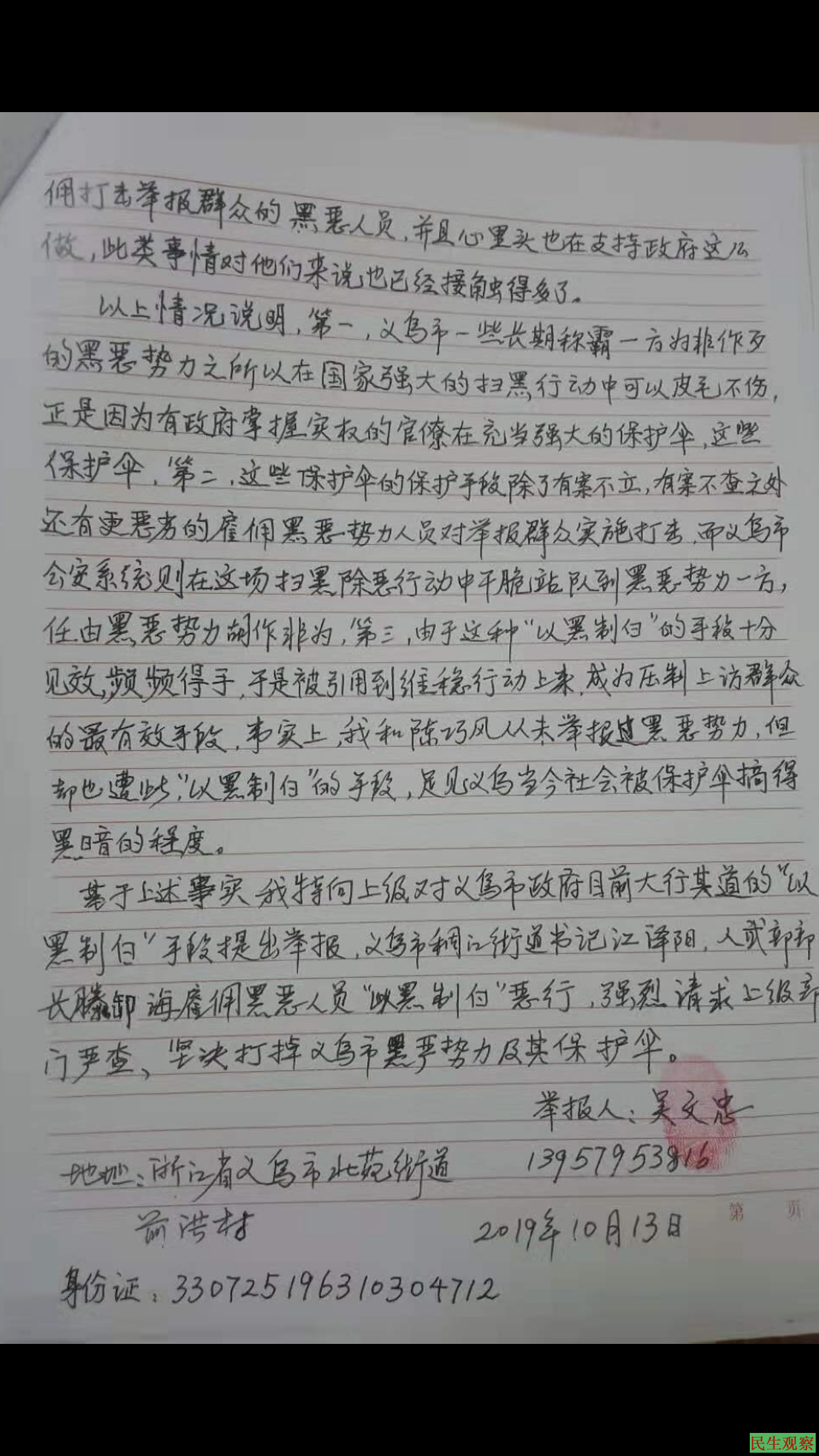 【民生观察2019年11月1日消息】本网获悉,2019年10月29日,浙江义乌市维权人吴文忠,从广州坐车到北京西站下车后,突然被十几个人非法拦截,目前被控制在北京鼓楼西大街宾馆里。另外,同是义乌访民的陈巧凤被以涉嫌妨害公务罪刑拘,至今还在羁押中。