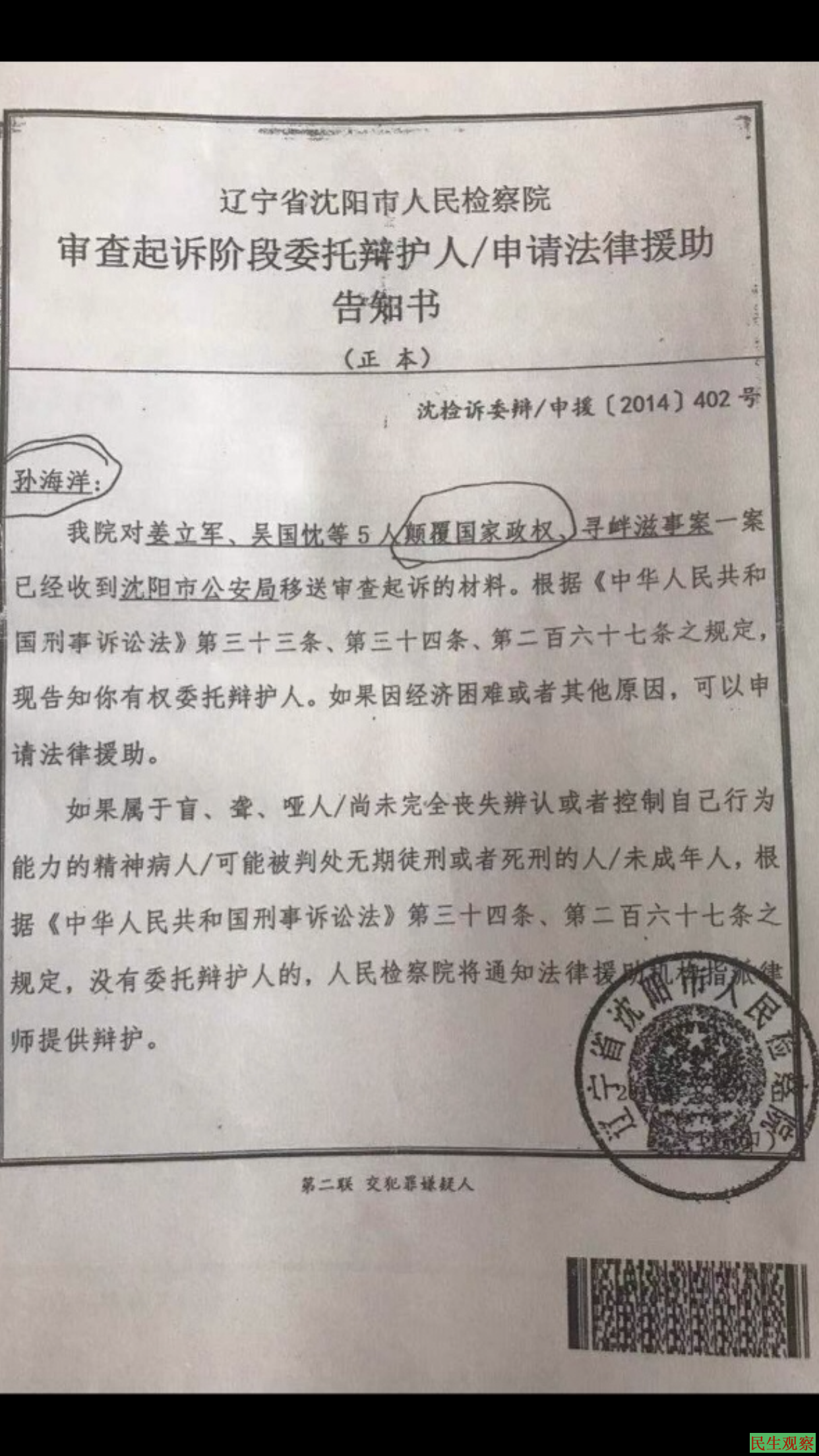 后来,孙海洋因为颠覆国家政权、寻衅滋事、非法经营,共三项罪名,于2014年5月18日晚上,被送进了沈阳市第一看守所。经沈河区检察院批捕、沈阳市检察院呈报、辽宁省高级检察院指派,2015年3月9日大东区检察院继续侦办孙的案件。