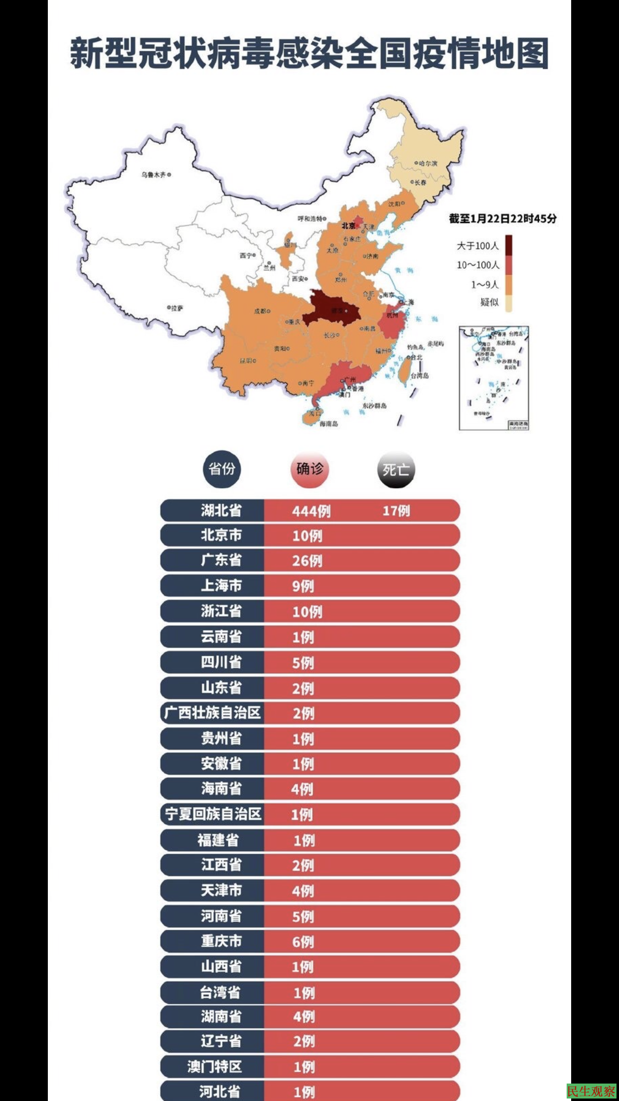 截止22日晚十点为止,按照官方通稿公布的数字,感染人数尚处于千人之下,死亡更不足二十人。感染地区除始发疫区武汉外,中国多省已有几例到数十例不等的记录,包括香港、广东、浙江、北京、上海、四川、天津、湖南等地。而国外亦已有传入性感染个案,包括韩国、日本、法国、美国等地。根据各国各地的通报情况,此次疫情已经遍地开花,世界卫生组织已经发出紧急警告,各国正在进一步加强疫情防止及控制工作。
