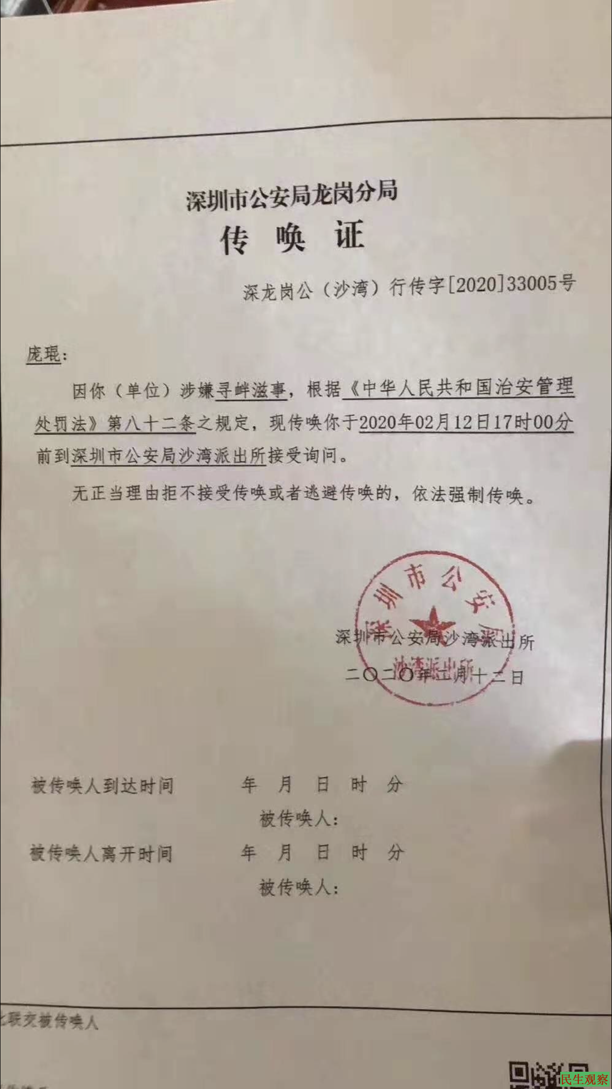 2月12日,庞琨律师突然接到深圳市公安局的传唤书,要求他于2020年2月12日17时到深圳市公安局沙湾派出所接受询问。如无正当理由拒不接受传唤或者逃避传唤的,依法强制传唤。传唤理由是,庞琨涉嫌“寻衅滋事”。