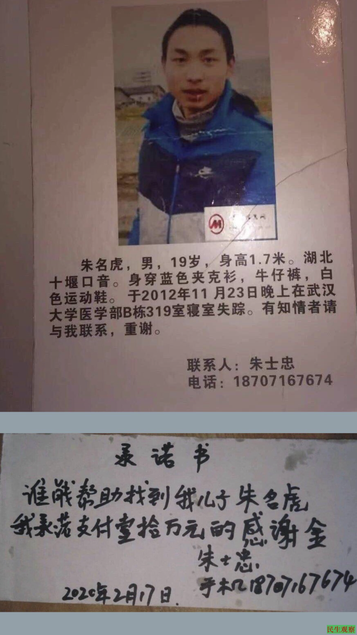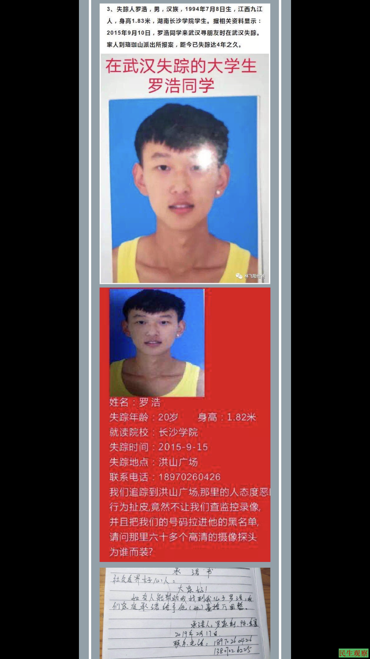 【民生观察2020年3月15日消息】自2017年媒体曝光三十多名武汉大学生神秘失踪后,几年来这一数据一直攀升到了数百人,都是有名有姓的大学生或同龄社会青年失踪。