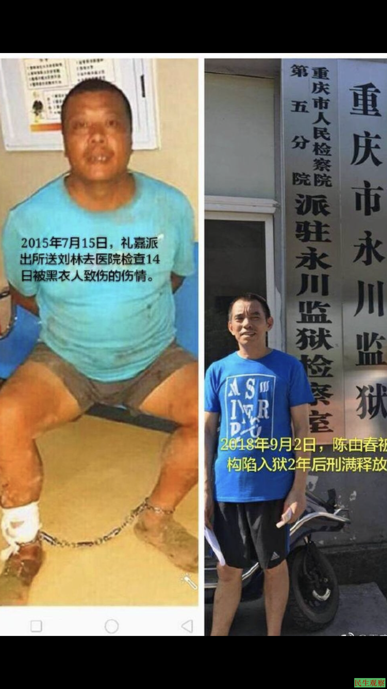 在礼嘉派出所,唐家明所长对我实施刑讯逼供,构陷我“寻衅滋事,妨害公务”的莫须有罪名,让我含冤入狱三年,我于2018年7月13日刑满释放。之后,我的哥哥陈由春被以同样罪名构陷入狱两年,并于2018年9月2日刑满释放。
