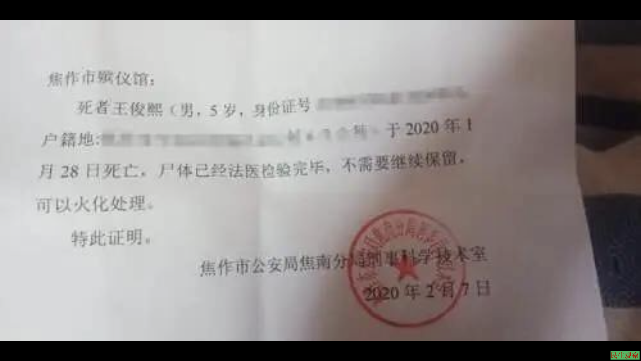 【民生观察2020年4月20日消息】2019年3月27日,河南省焦作市解放区萌萌幼儿园小班老师王某,在孩子们加餐吃的八宝粥里投放亚硝酸钠,导致中班23名孩子中毒,5岁的小俊熙成为最不幸的受害者。2020年4月13日,萌萌幼儿园中毒受害者王俊熙的妈妈张女士悲愤交加地表示,“儿子被幼儿园老师投毒,孩子遗体至今存放在殡仪馆,焦作市公安局焦南分局通知我们办火化手续,火化后法院就可以开庭审理了。但是我们不能理解的是,有些事还没处理,为啥就急着让家属先火化孩子遗体,作为家属我们想要一个说法为啥这么难。”