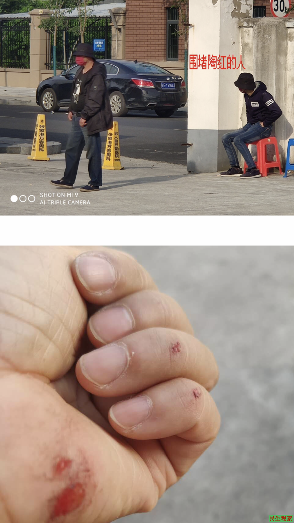 被宣布强制隔离后,警察驾驶警车把陶红押送回家(拆迁过渡房)看守,警方派来了几名维稳人员值守在她家门前,严禁其出门及来客。对此,陶红十分气愤,她申辩说,陶红在疫情比较严重的3月份也去探视过伯父,当时检测过体温后就放行了,返回后社区后也没有被要求隔离。如今,江苏疫情已大幅缓解,凭健康码居民可以自由出行,陶红19日再次探望伯父后,就被维稳警察抓回,并被宣布为防疫强制隔离。显然,这是维稳部门假借防疫为由,实施两会非法维稳、拘禁的恶行。还有,在陶红被强制隔离后,她拿出手机拍摄围堵人员,这些人又一次抢夺她手机,并再次殴打了她。