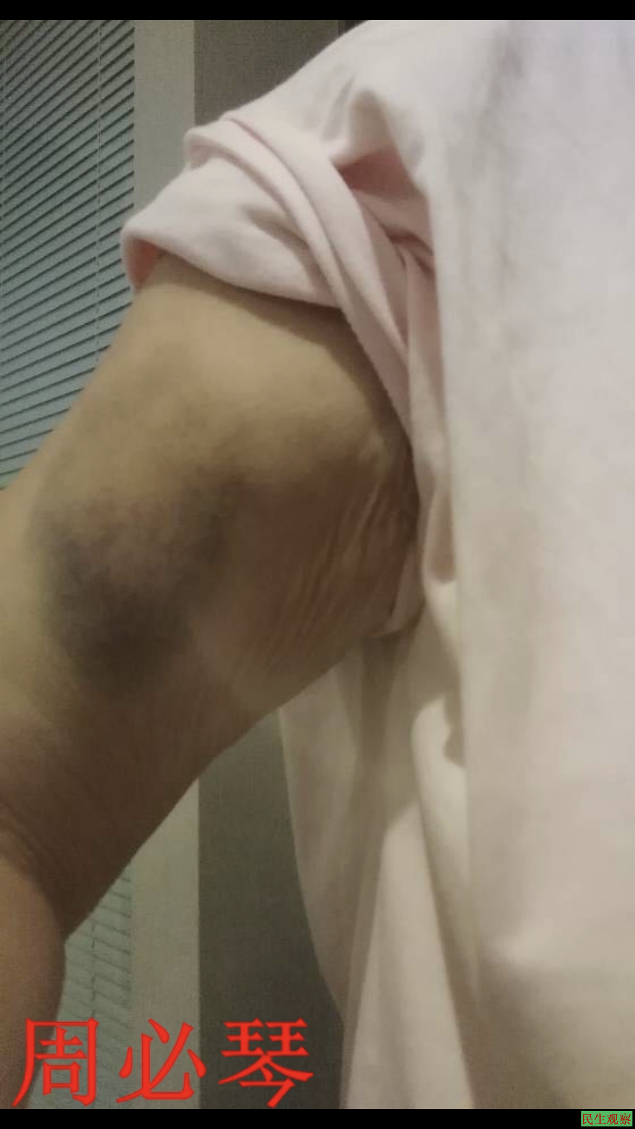 3、重庆周必琴:从2020.5.17日高家场46-3黑监非法收了我身份证,手机,现金,到昨晚,他们所为的核酸检查回到宾馆己是近10点回兴街道办,高岩居委会赖春全,才把手机及现金归还我,直到现在都扣押我的身份证,没归还我,他们要我一起去吊鱼,所为的代表政府,没有承信,我不会跟他们去任何一个地方,友友们请多关注,下面我把丰台区高家场46-3黑监狱,我被抓打的伤发给大家看。