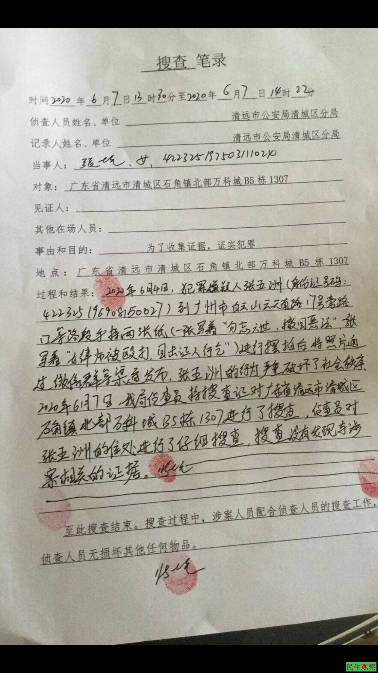 张五洲举牌后翌日,即6月5日下午两点左右,广东清远清城区石角派出所去到张五洲所住寓所,以涉嫌“扰乱公共秩序”为由对其进行传唤,关押一日后于6月6日转为刑事拘留,罪名更改为“寻衅滋事罪”,羁押于清城区看守所。警方并在6月7日上门搜查,当时正在寓所的张五洲妹妹张唯楚(张七毛)被按警方要求在《搜查笔录》上签字。根据警方在《搜查笔录》上的记录,经侦查人员仔细搜查并未在张五洲的寓所发现“举牌”案的相关证据。