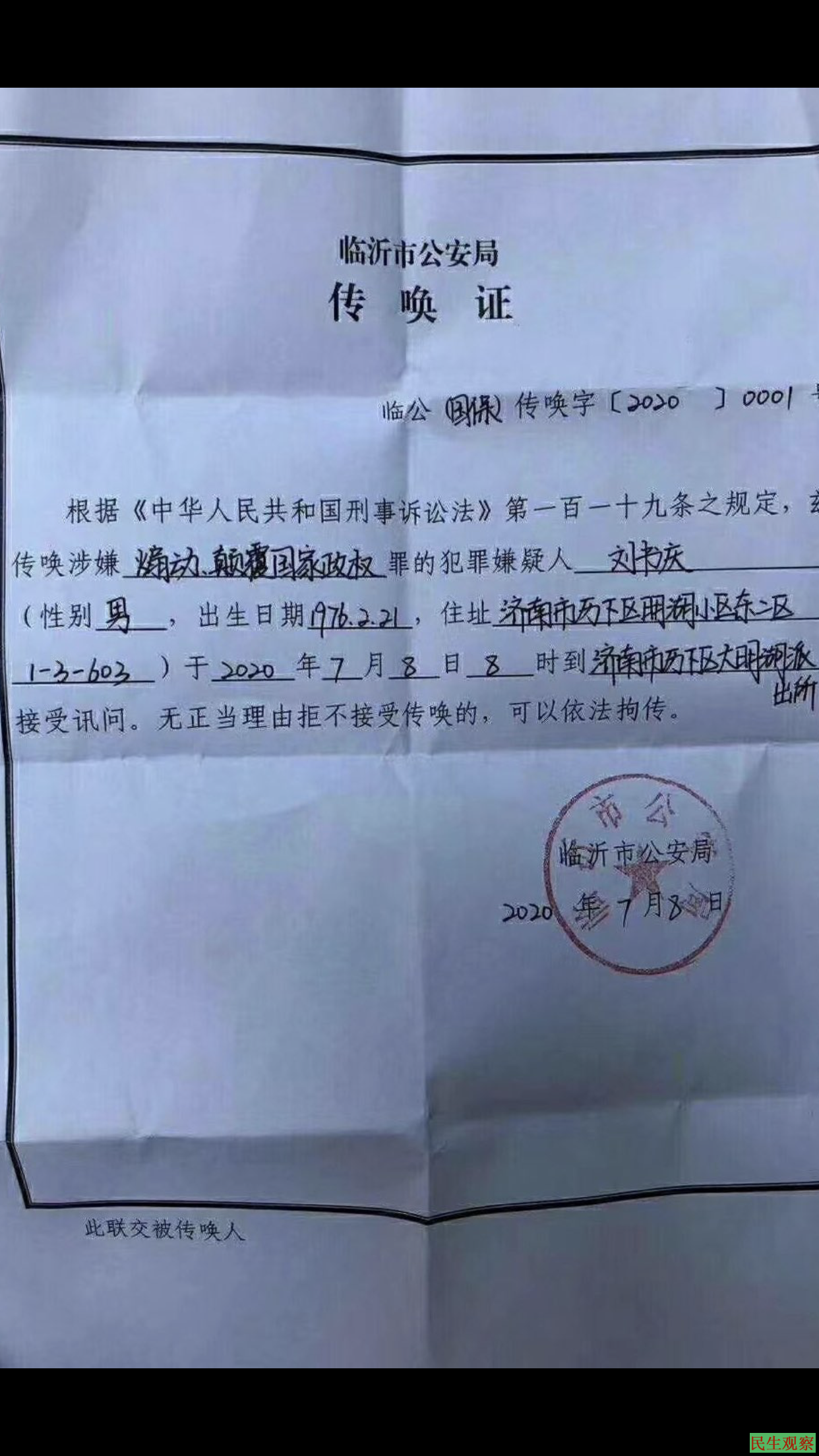 【民生观察2020年7月10日消息】本网获悉,7月8日上午8时,山东人权律师刘书庆被山东临沂市公安局以涉嫌“煽动颠覆国家政权罪”传唤至辖区大明湖派出所。