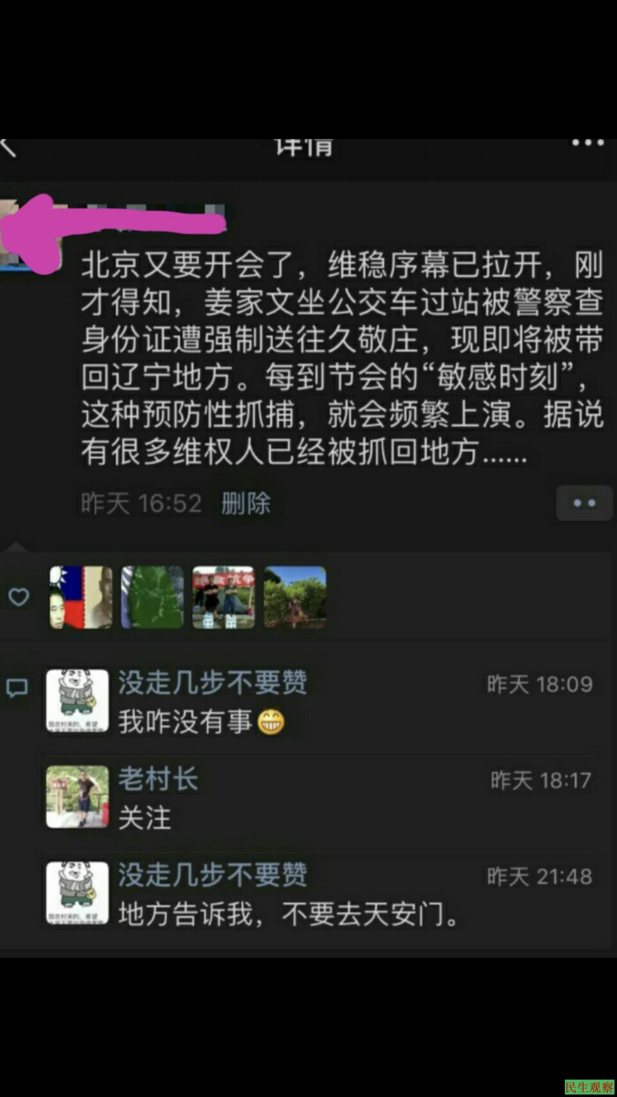 【民生观察2020年10月21日消息】2020年10月19日北京又要开会了,维稳序幕已拉开,刚才得知,姜家文坐公交车过站被警察查身份证遭强制送往久敬庄,现即将被带回辽宁地方。每到节会的“敏感时刻”,这种预防性抓捕,就会频繁上演。据说有很多维权人已经被抓回地方。