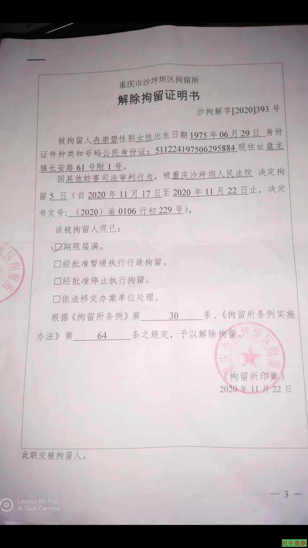 【民生观察2020年11月25日消息】2020年11月17日,重庆维权人士冉崇碧因旁听朋友案件审理时,要求行使公民权利遭到审判长冯晞的反对,随后被法警绑架带离法庭关押至法院地下室,当晚被送到看守所行政拘留。