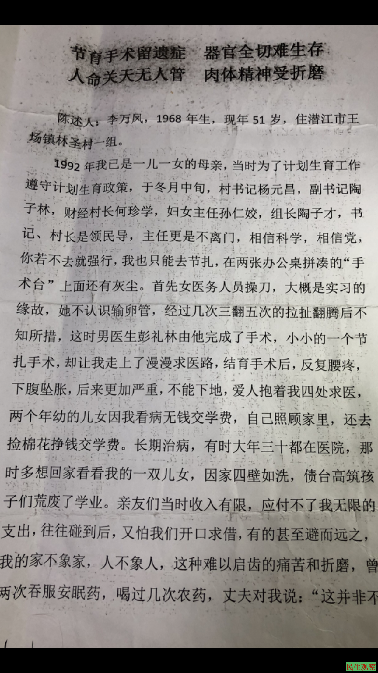 湖北潜江李万凤是属于计划生育结扎失败的受害者,政府应该把他们纳入免费看病之内,但是政府根本没有为他们设立计划生育受害后期看病的管理机构,湖北潜江计划生育手术失败的有几百人,李万凤只是其中一个而已,她们从24岁到现在几十年一直在病魔中,真是生不如死,她们从二十多岁就失去了劳动能力,也失去了性,她们背负着对家庭的内疚,还有对老公的内疚,她们一生的痛苦无人能理解与体会,潜江市王场镇书记,镇长村长,队长等相关领导你们还有人性吗?你们把李万凤从北京”看病”带回家路途发病不及时送医院,还把她丢弃在医院外面,是司机怕担当责任,连夜把李万凤送镇医院门口,随后其他人员得知李万凤是真的病急,最后他们打的到医院,也只是看了一眼就走了,医疗费用都是李万凤自己负担的。