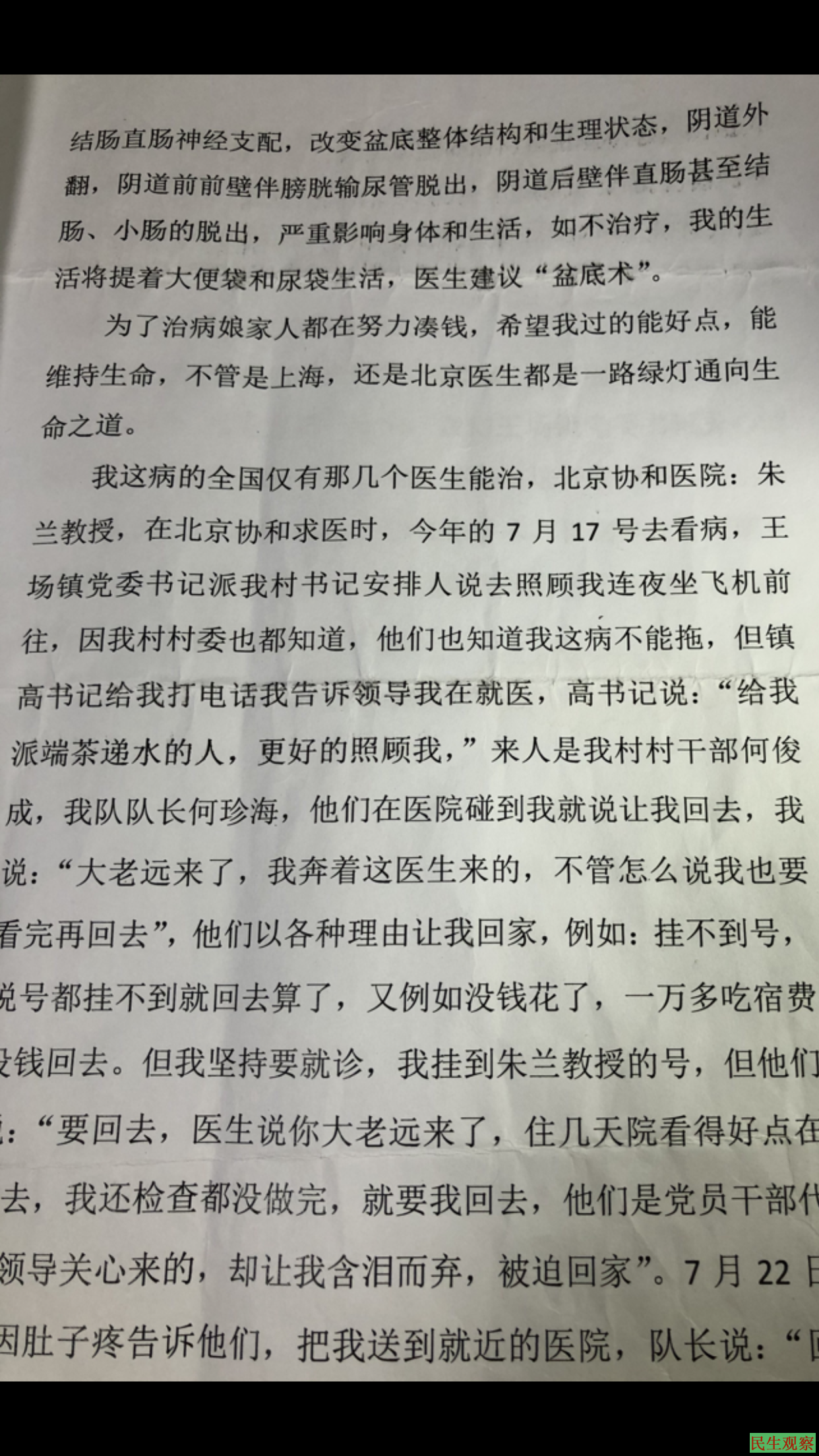 李万凤计划生育结扎失败的病例全国仅有几个医生能懂,他们有这方面的经验,在北京协和医院的朱兰教授,在北京协和求医时,在2019年7月17日去看病,潜江王场镇党委书记按派村书记,村书记安排人去照顾李万凤连夜坐飞机前往北京,从村书记到到镇书记,再到市政府,市计划生育办公室,等所有单位领导都知道计划生育结扎失败受害者的病情,计划生育办公室现已经改为计生委办公室了,相关所有领导都知道李万凤的病不能再拖了,但是镇高书记给李万凤安排照顾她的是本村干部何俊成,还有本村队队长,何珍海,他们来医院后就让李万凤回去,李万凤说;我大老远的来一次不容易,来了就是奔着这医生来的,不管怎么我也要看完病再说,镇书记安排的人员以各种理由让李万凤回去,比如说;挂不上号,说专家号挂不上不如回去算了,又说带的钱不够了。