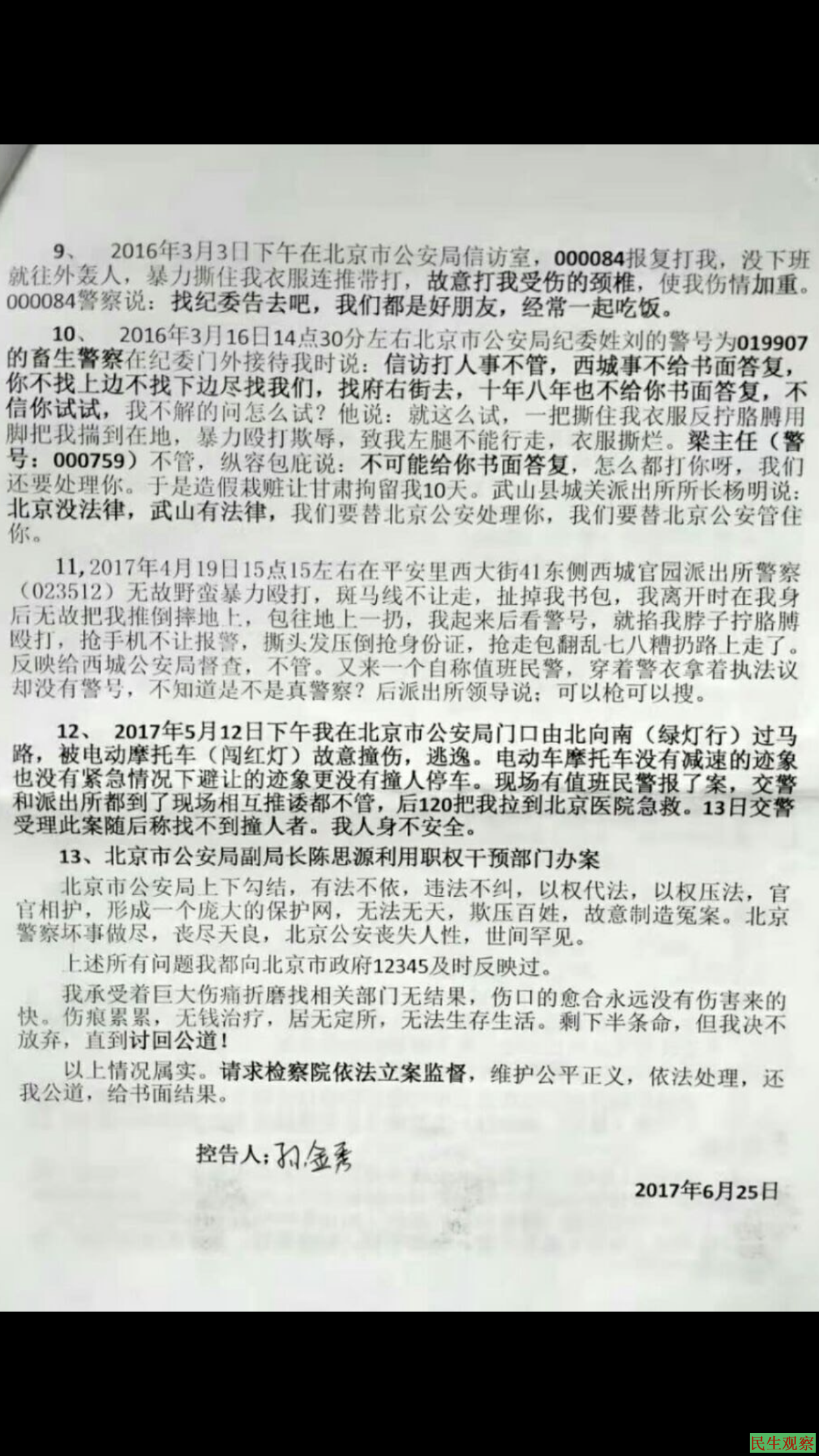 到下午14.30分,孙金秀好不容易到了机器安检处,按要求把手机及随身携带的物品放在筐里经过机器检查后由保安保存,然后脱了外衣和信访材料放筐里过机器检查,做完这些,还继续要孙金秀脱衣服,由于孙金秀身体虚弱不适合在北京室外低气温情况下再脱衣服,因为棉衣外套已经脱了,孙金秀当时拒绝再脱衣服,解释再三不让进去反映问题,警察黄(不让看警号)指挥保安使用暴力一直把孙金秀拉扯到公路边的铁皮围圈里限制人身自由,随后归还了孙金秀的手机及随身物品后,孙金秀报警,报警完后才发现手机屏被破损几道裂痕,装手机的小布袋也是破的。这就是冤民的遭遇和现状。冤民的人权在哪里?