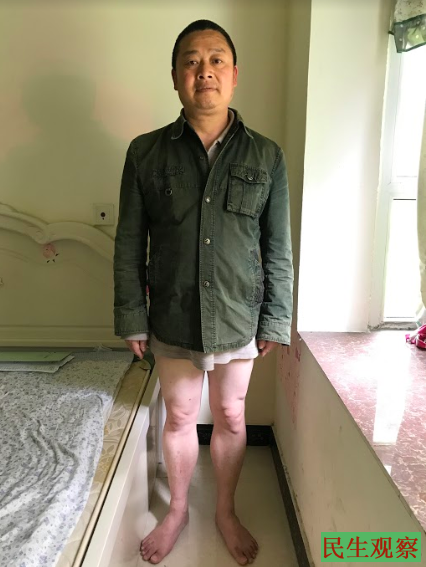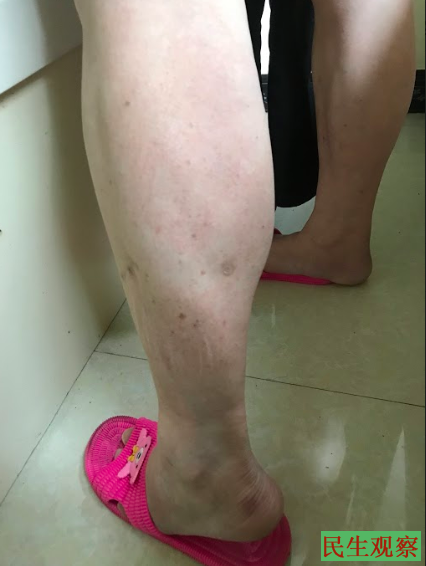 在行刑后,我左腿淤青变肿,行走困难,我多次请求看病,都遭到他们拒绝,大概是他们想留点证据。