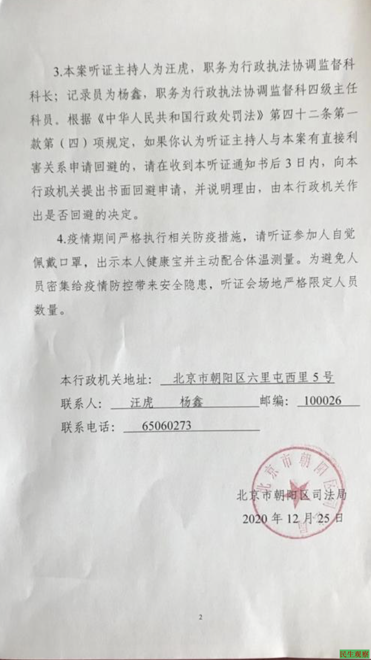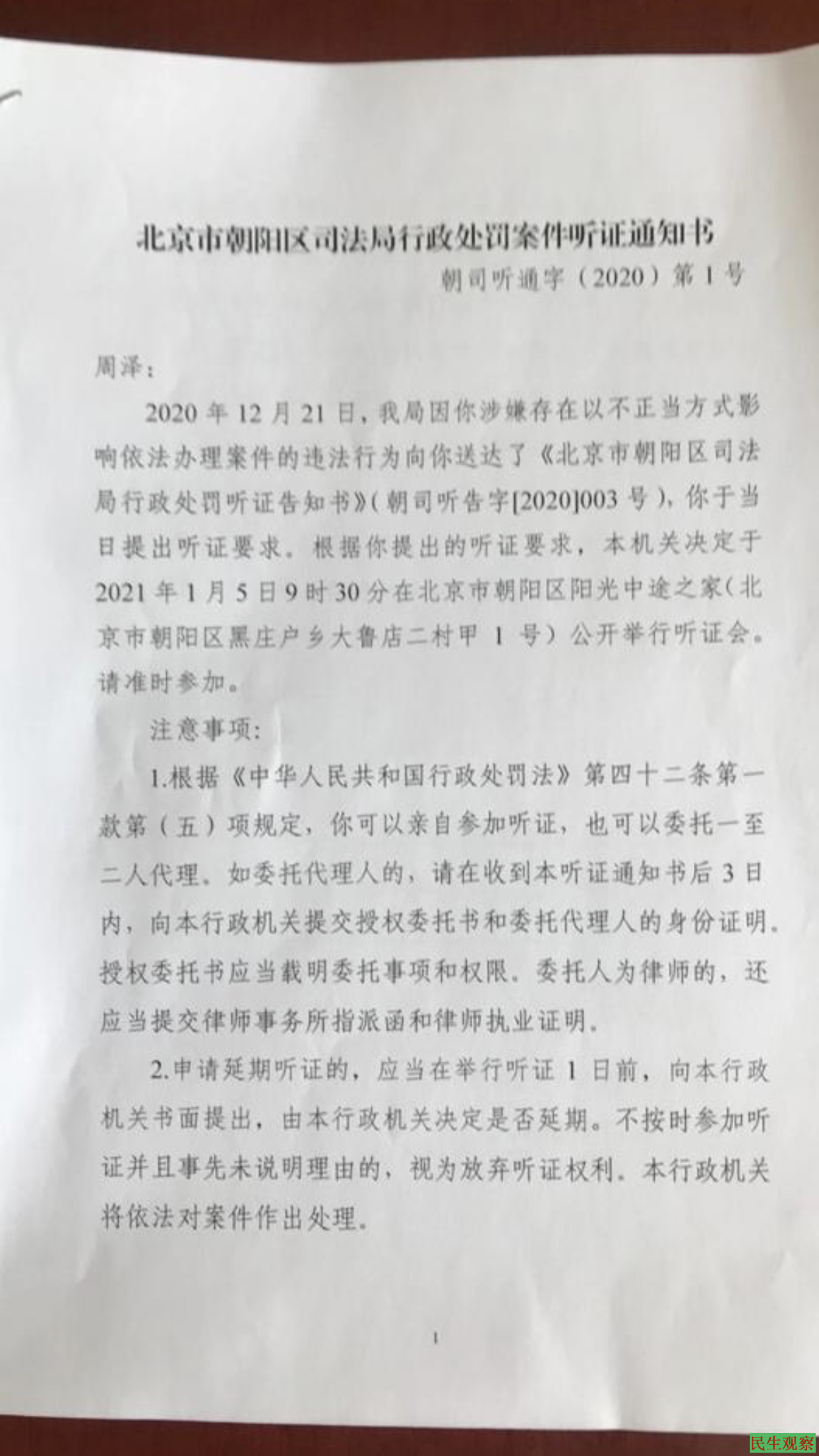 【民生观察2021年1月5日消息】本网获悉,2021年1月3日,维权律师周泽接到北京市司法局通知:“关于《通知证人参加听证会申请》的答复。周泽:您于2020年12月31日递交的‘关于通知证人参加听证会的申请’我局已收悉。我局同意赵静作为证人在听证会上作证,赵静需遵守听证会会场秩序并如实作证。请您通知赵静携带身份证件,于听证会当日准时到达会场等候作证。特此答复。北京市朝阳区司法局。2020年12月31日”